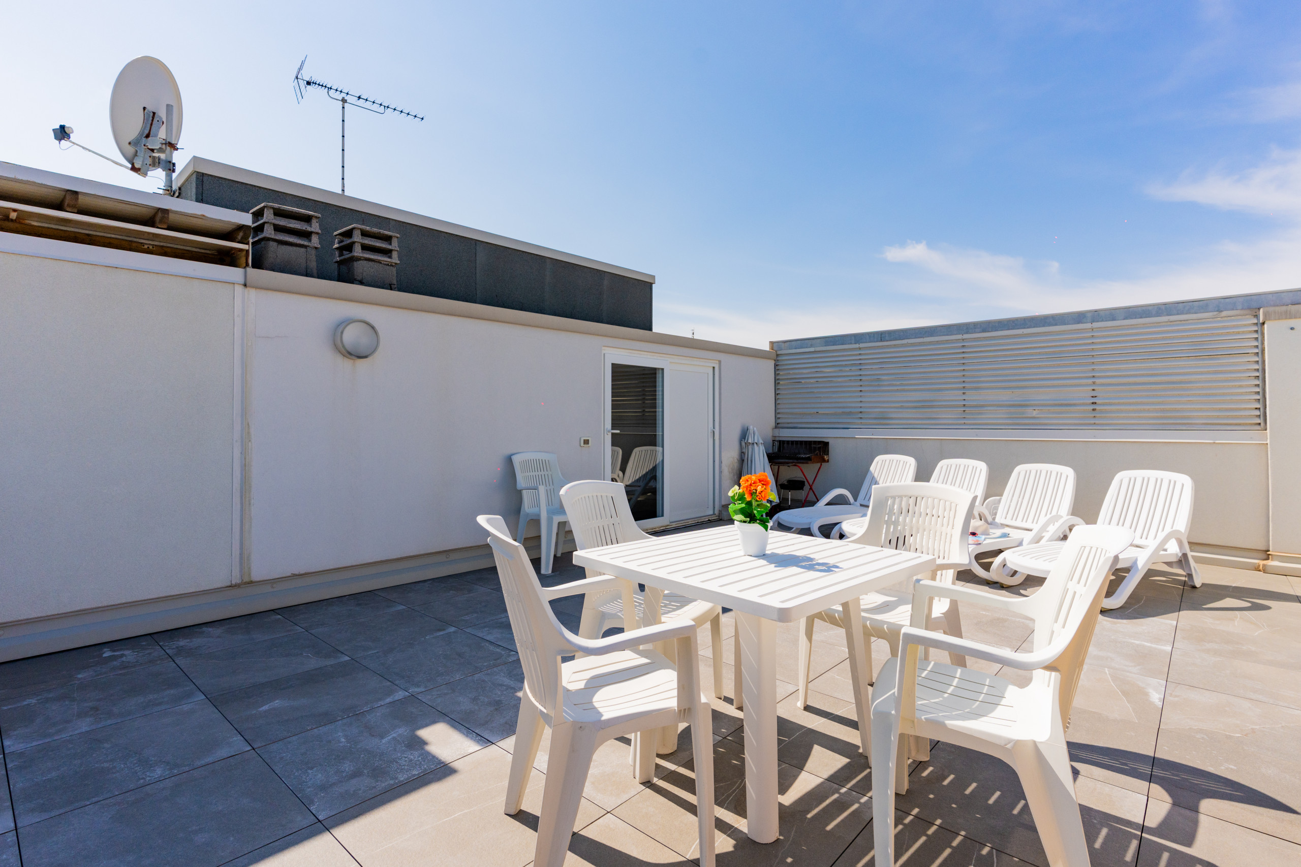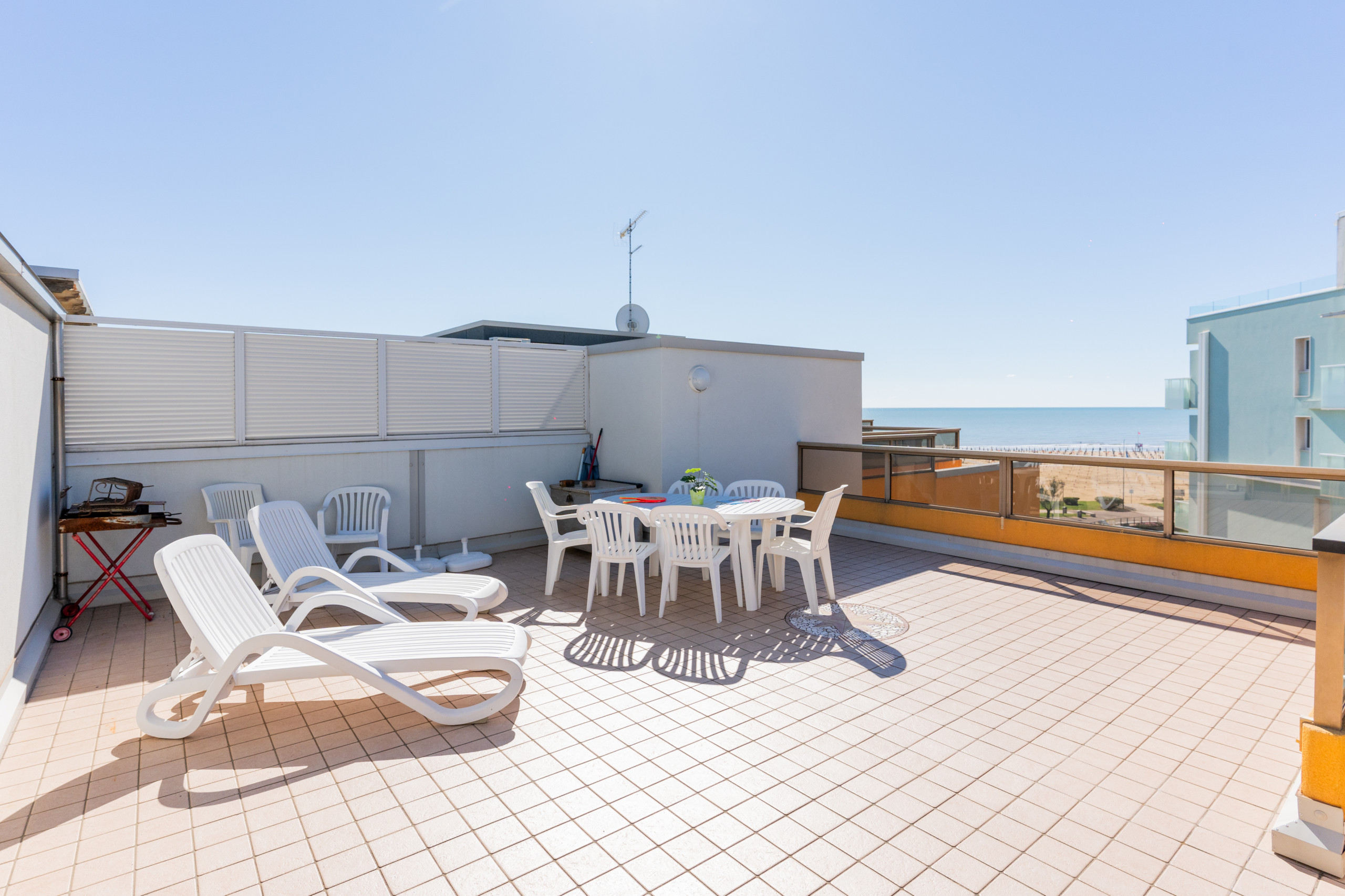 Auf der Dachterrasse, ausgestattet mit Einrichtungen und Kamin, können Sie Mittagessen, Abendessen und Momente der Entspannung mit einem spektakulären Blick auf die Adria verbringen.