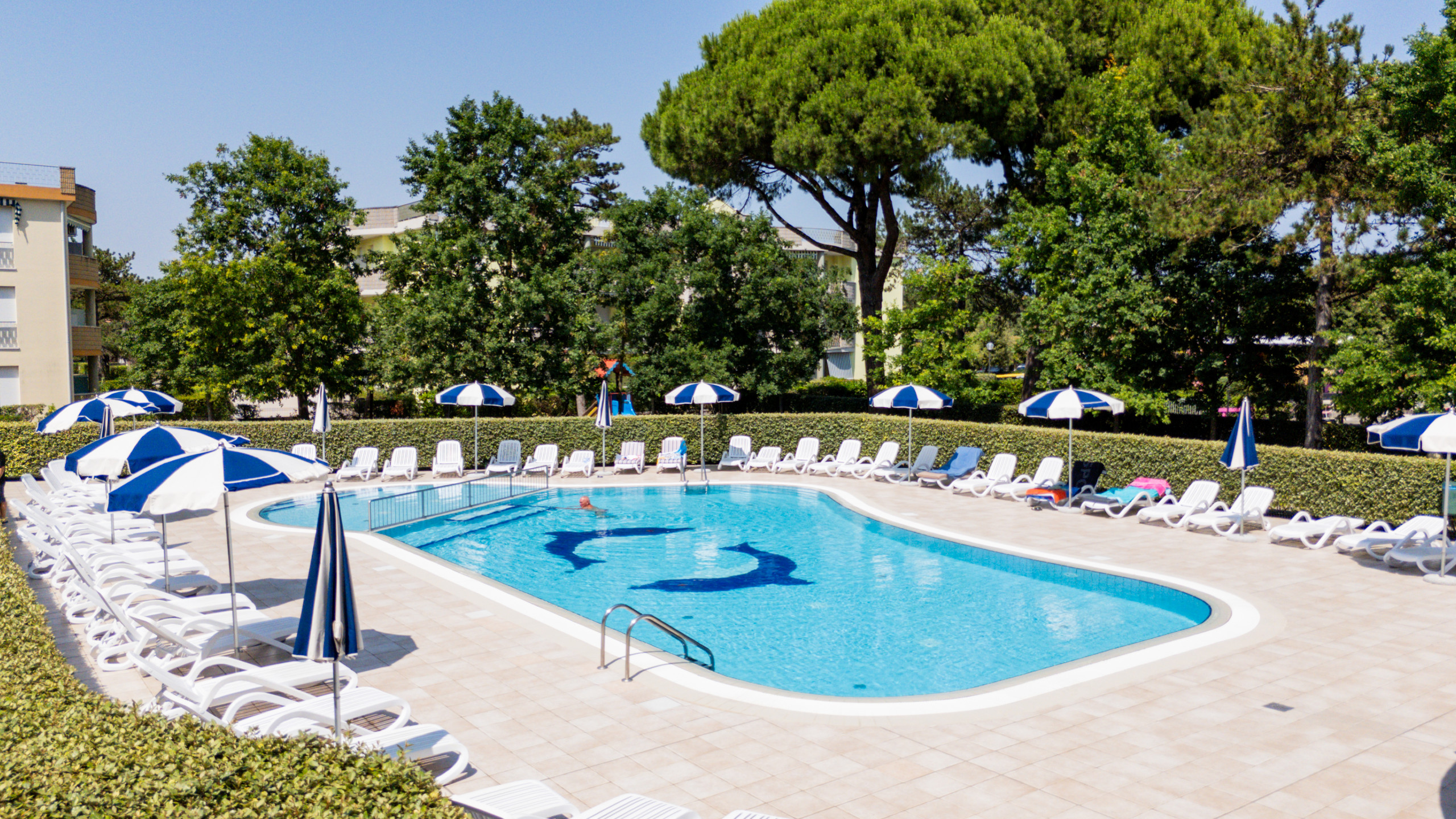 Die Struktur bietet einen großen Pool mit einem Bereich für Erwachsene und Kinder, umgeben von einem weitläufigen Solarium mit Sonnenliegen und Sonnenschirmen, ideal zum Entspannen in der Sonne und zum Genießen des langsamen Rhythmus der Sommertage.