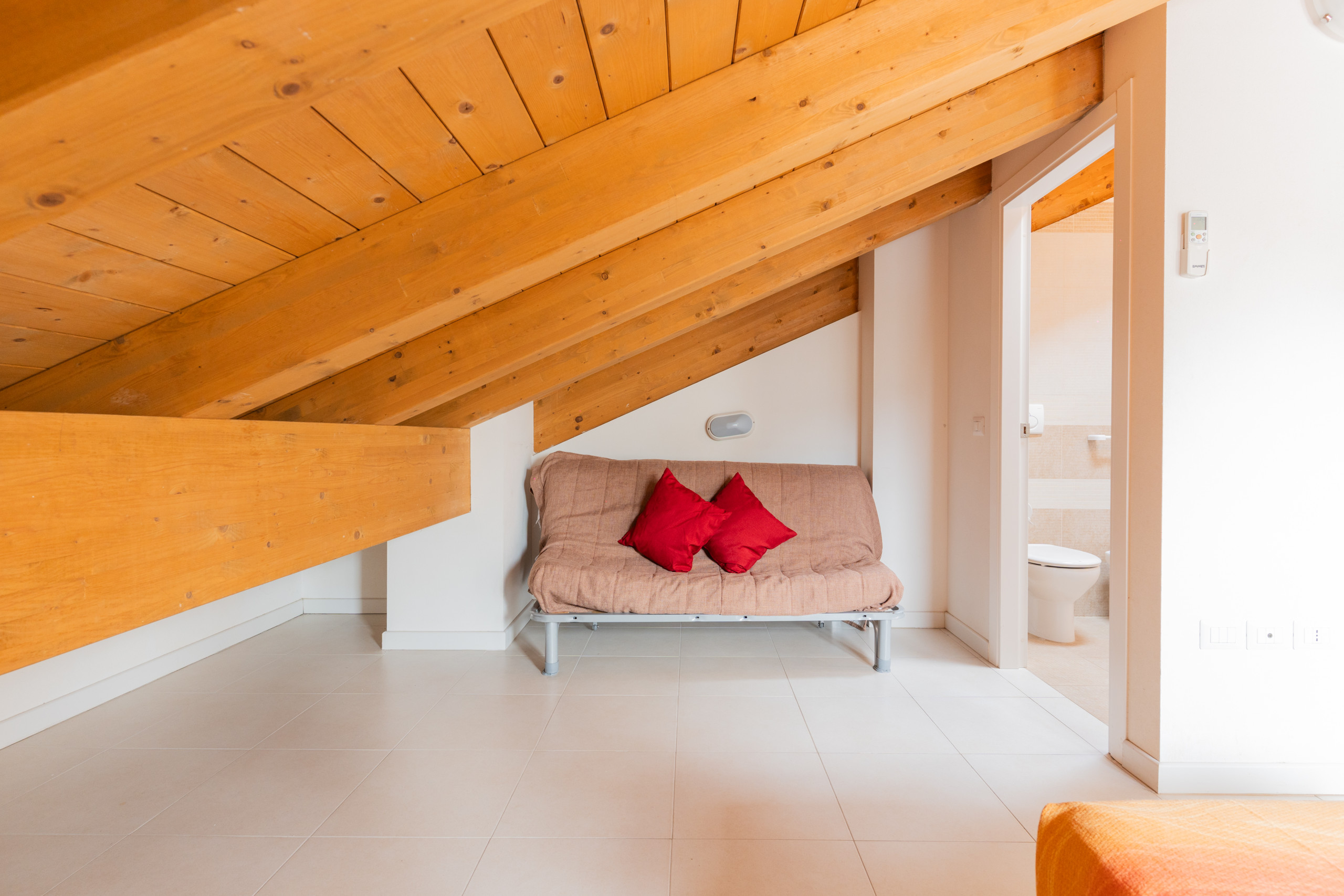 - Ein Aufenthaltsraum mit ausgestatteter Küchenzeile und Sofa (kein Bett)