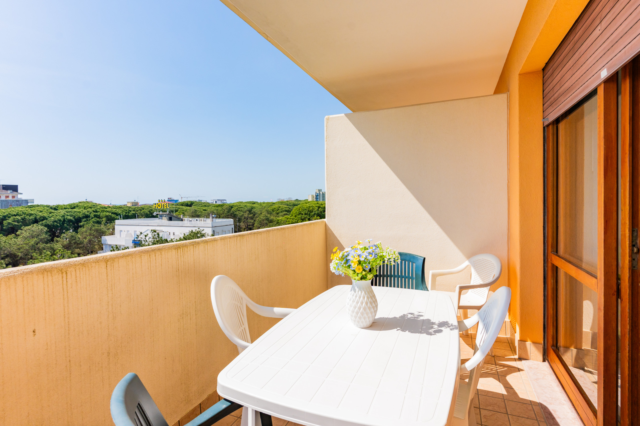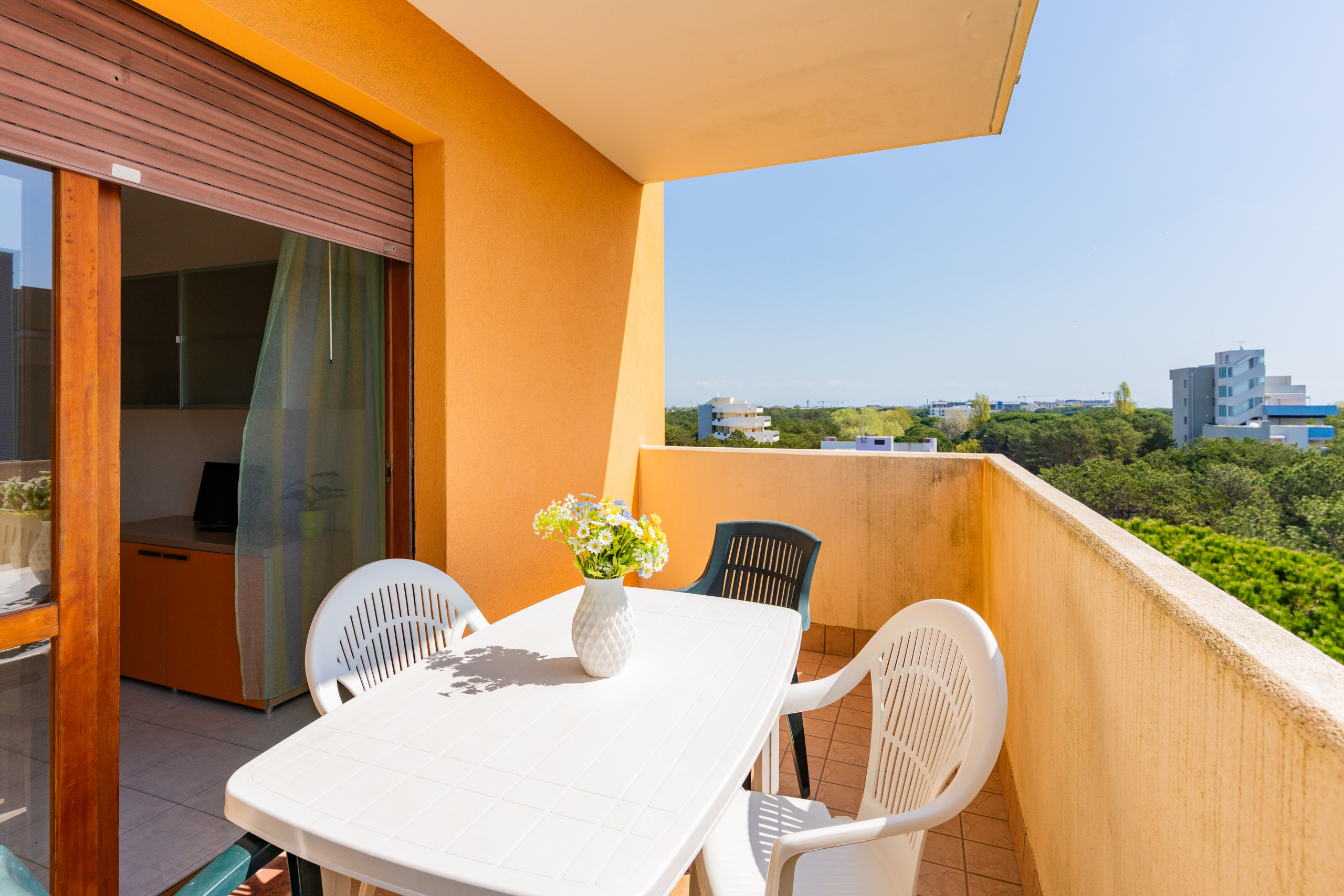 Die renovierten Dreizimmerwohnungen, die sich zwischen dem zweiten und dritten Stock befinden, bieten geräumige Terrassen oder Balkone mit Ausrichtung nach Süden oder Nordwesten, ideal zum Genießen eines Kaffees in der Sonne oder eines Abendessens im Freien mit Blick auf verschiedene Ausblicke von Bibione.