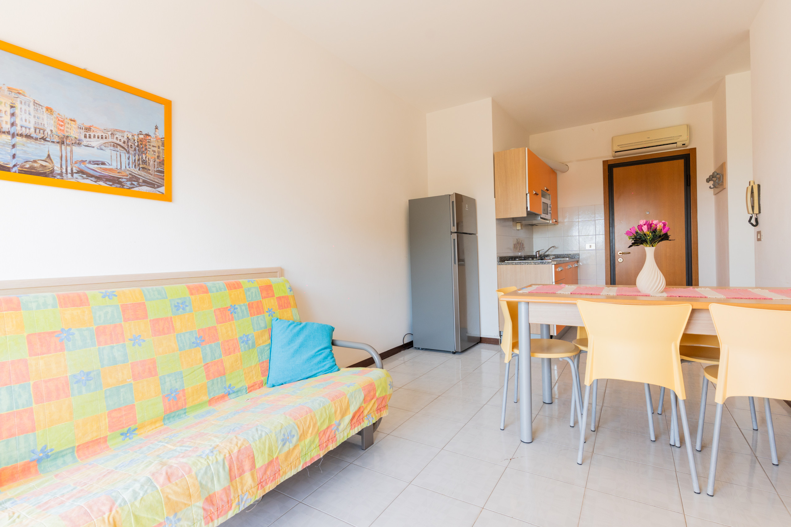 Jede Wohnung verfügt über Klimaanlage, TV, Sicherheitstür und Standkühlschrank, um Ihnen Praktikabilität und Entspannung während des gesamten Aufenthalts zu garantieren.