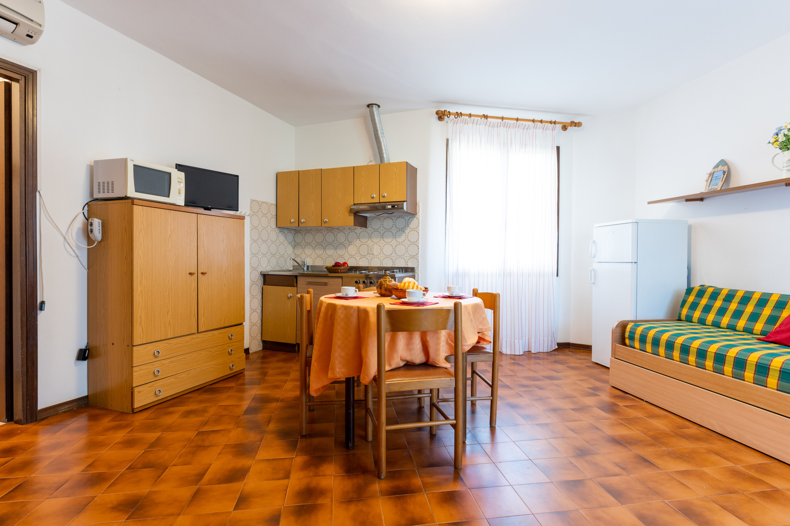 Im Inneren befinden sich ein Wohnzimmer mit ausgestatteter Küchenzeile und zwei Doppelschlafsofa, zusätzlich zu einem Badezimmer mit Duschkabine.