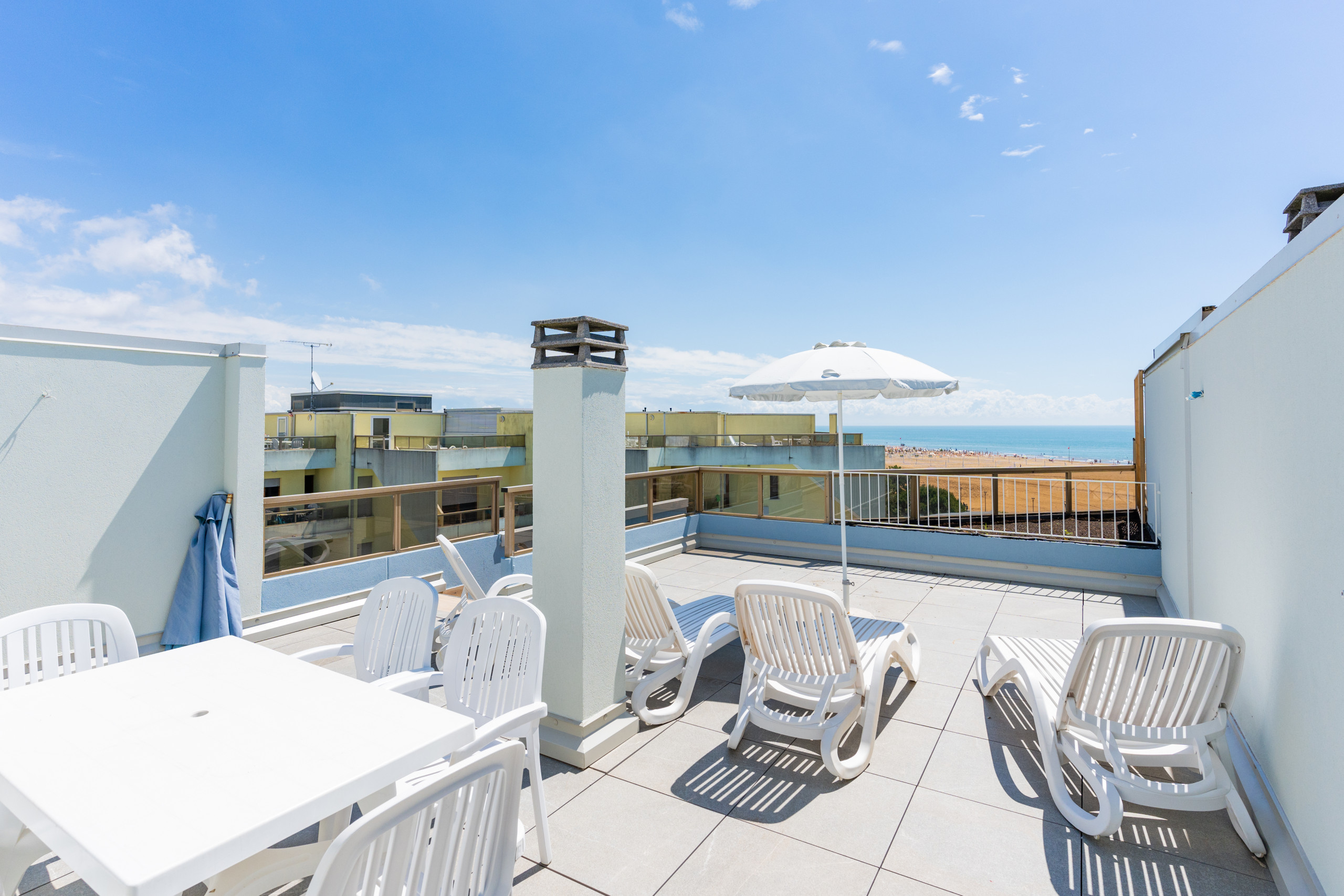 Die große Dachterrasse, ausgestattet mit Kamin und zweitem Badezimmer, ist der ideale Ort für Abendessen im Freien, Momente der Entspannung und Frühstück mit Blick auf die Adria.