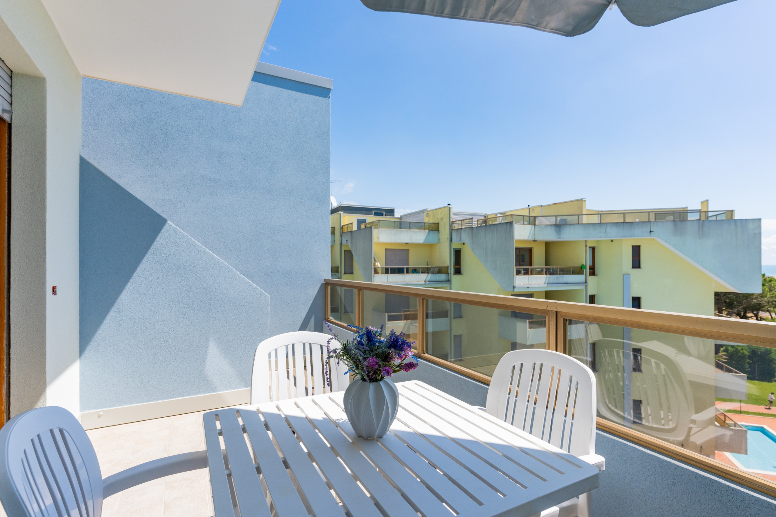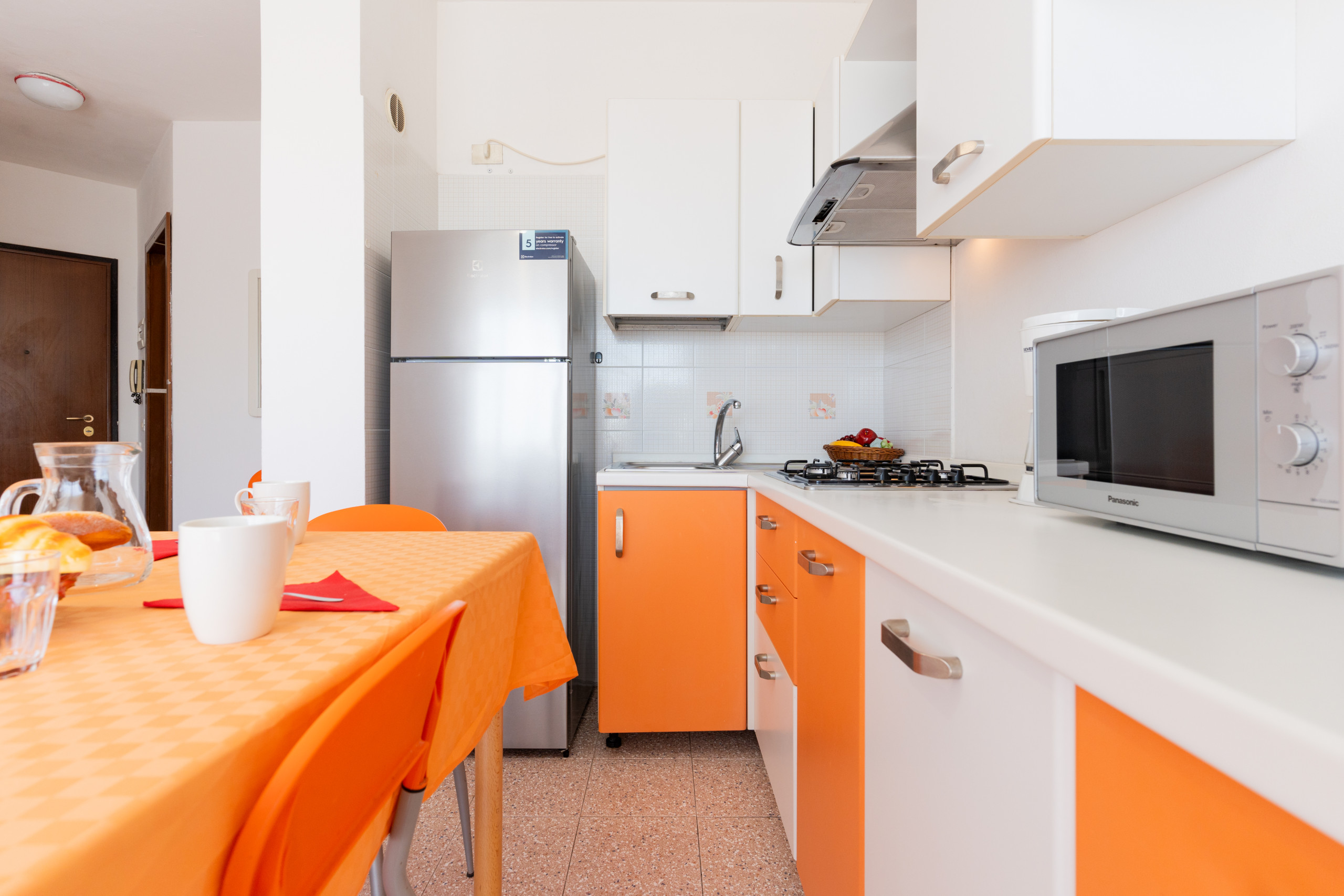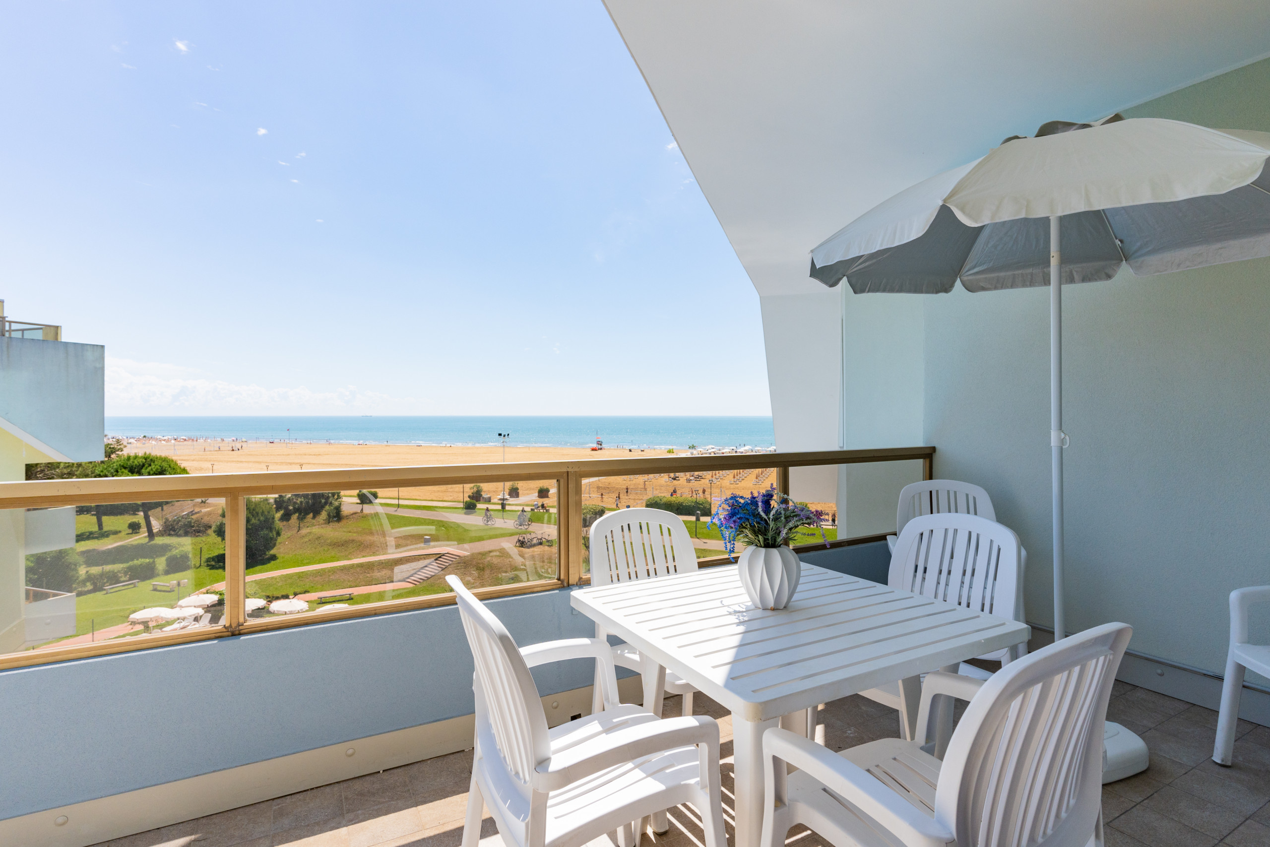 Die renovierten Dreizimmerwohnungen, die sich zwischen dem zweiten und dritten Stock befinden, bieten geräumige Terrassen oder Balkone mit Ausrichtung nach Süden oder Nordwesten, ideal zum Genießen eines Kaffees in der Sonne oder eines Abendessens im Freien mit Blick auf verschiedene Ausblicke von Bibione.