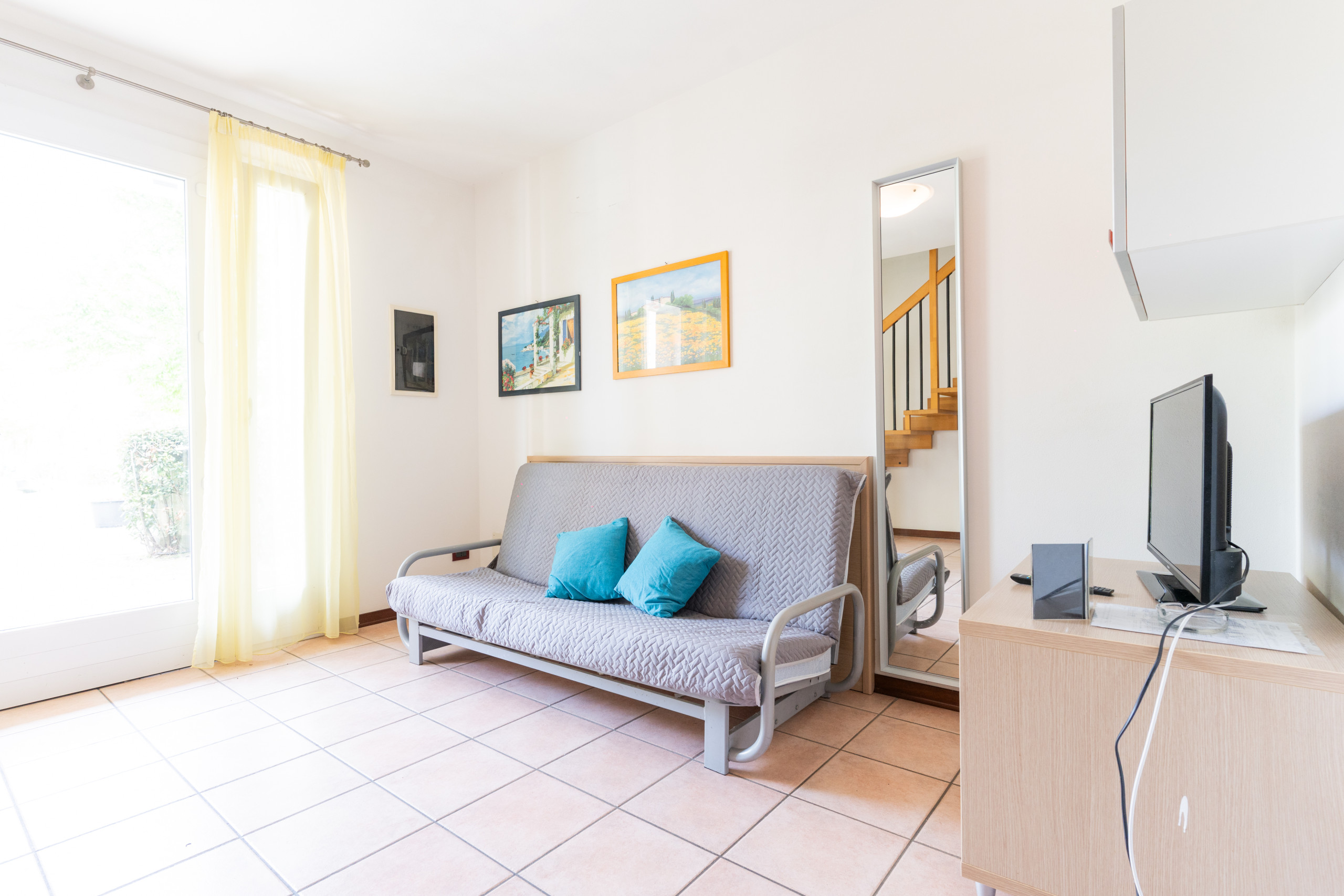 Im Erdgeschoss schaffen das Wohnzimmer mit Küchenzeile und das bequeme französische Doppelbettsofa eine einladende und funktionale Atmosphäre. Über die Innentreppe gelangt man in das erste Obergeschoss, wo sich das Schlafzimmer mit Balkon befindet, ausgestattet mit einem Doppelbett und einem Einzelbett, sowie ein geräumiges Badezimmer mit Duschkabine.