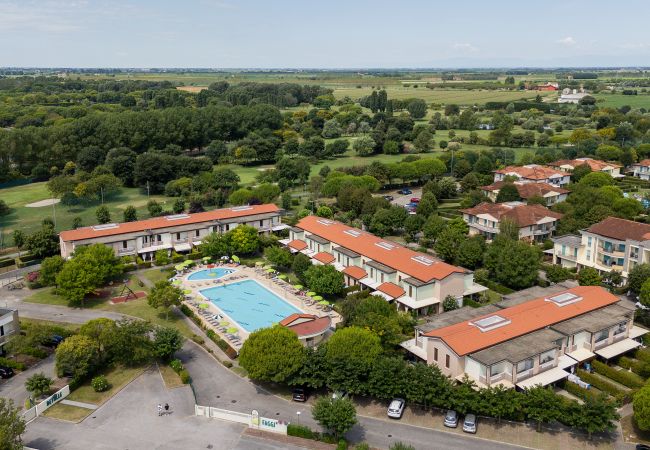 Die Zweizimmerwohnungen haben eine Fläche von 45 m² und erstrecken sich über zwei Etagen. Einige verfügen über einen Garten und eine möblierte Veranda, andere nur über eine Veranda, die immer mit Tisch und Stühlen ausgestattet ist, perfekt für Mahlzeiten im Freien. Die Villen bieten verschiedene Ausblicke und Aussichten, vom Swimmingpool bis zur Auffahrt, bis hin zum stimmungsvollen Golfplatz.