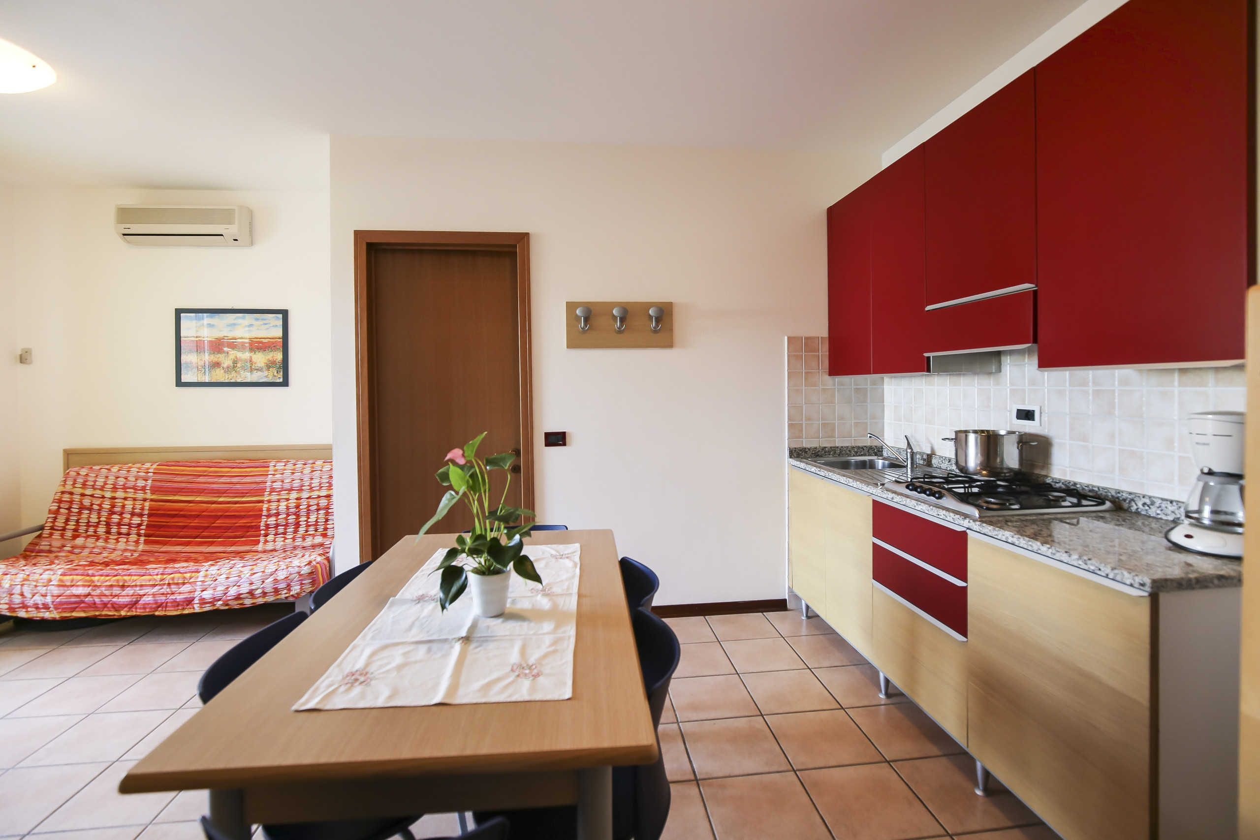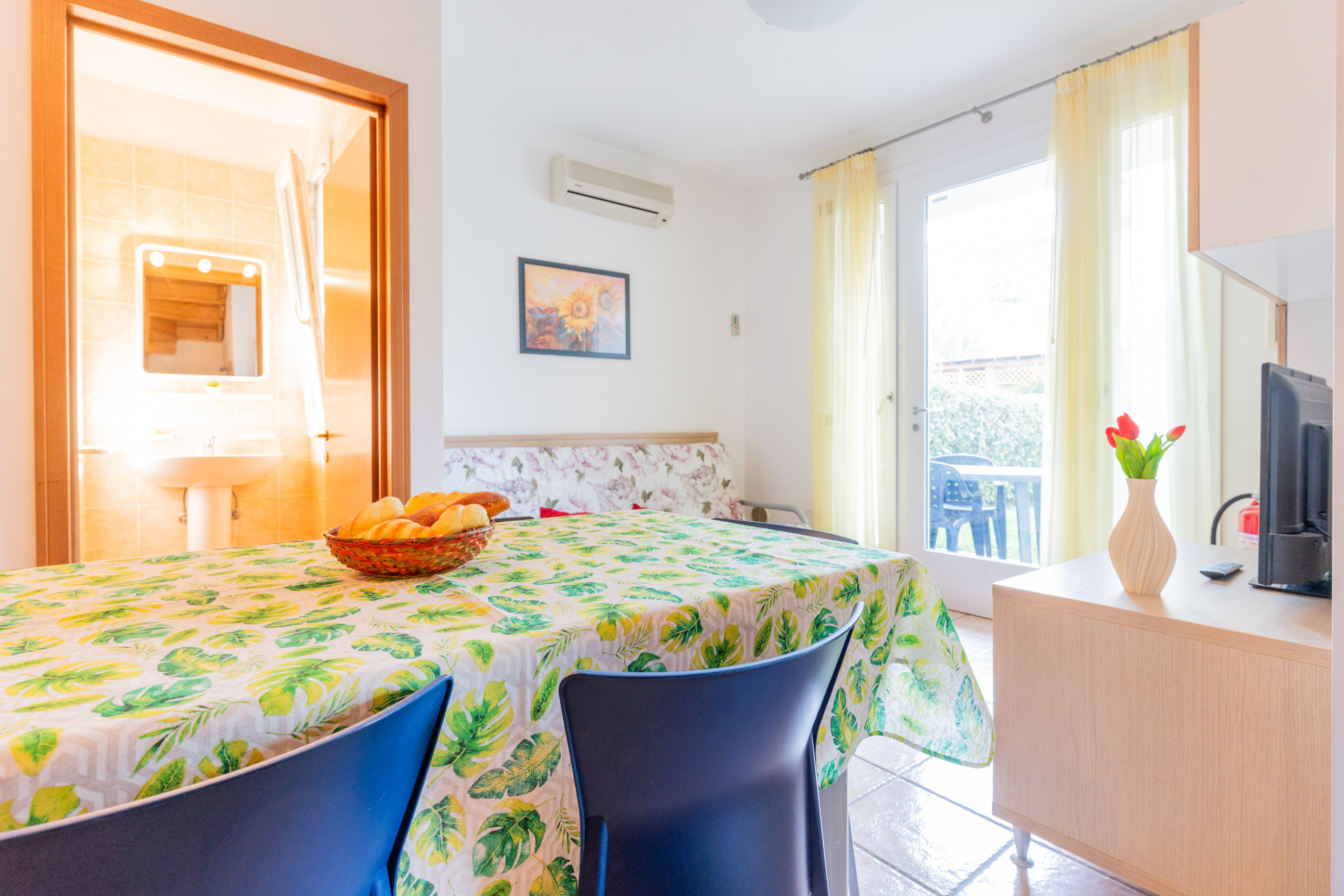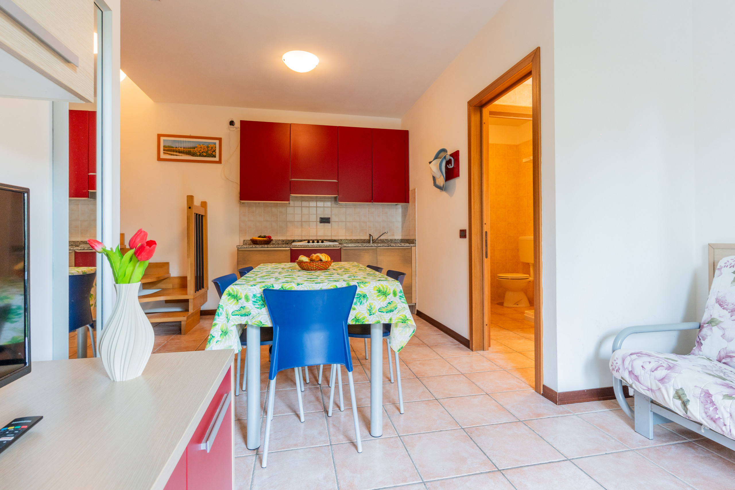 Die Dreizimmerwohnung, die sich im Erdgeschoss befindet, kann bis zu 6 Personen beherbergen und bietet einladende und lichtdurchflutete Räume. Sie besteht aus einem Wohnzimmer mit ausgestatteter Küchenzeile und Doppelbettsofa, einem privaten Garten, der ideal für Mahlzeiten oder Entspannung im Freien ist, einem Badezimmer mit Dusche, einem Schlafzimmer mit Doppelbett und Zusatzbett sowie einem Kinderzimmer mit Einzelbett.
