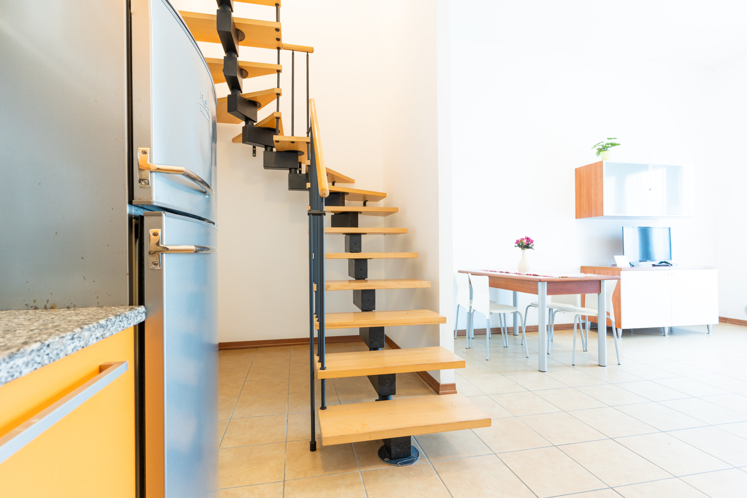 - Erdgeschoss: Wohnbereich mit ausgestatteter Küchenzeile, Esstisch mit Stühlen und praktisches Schlafsofa (französisches Doppelbett);