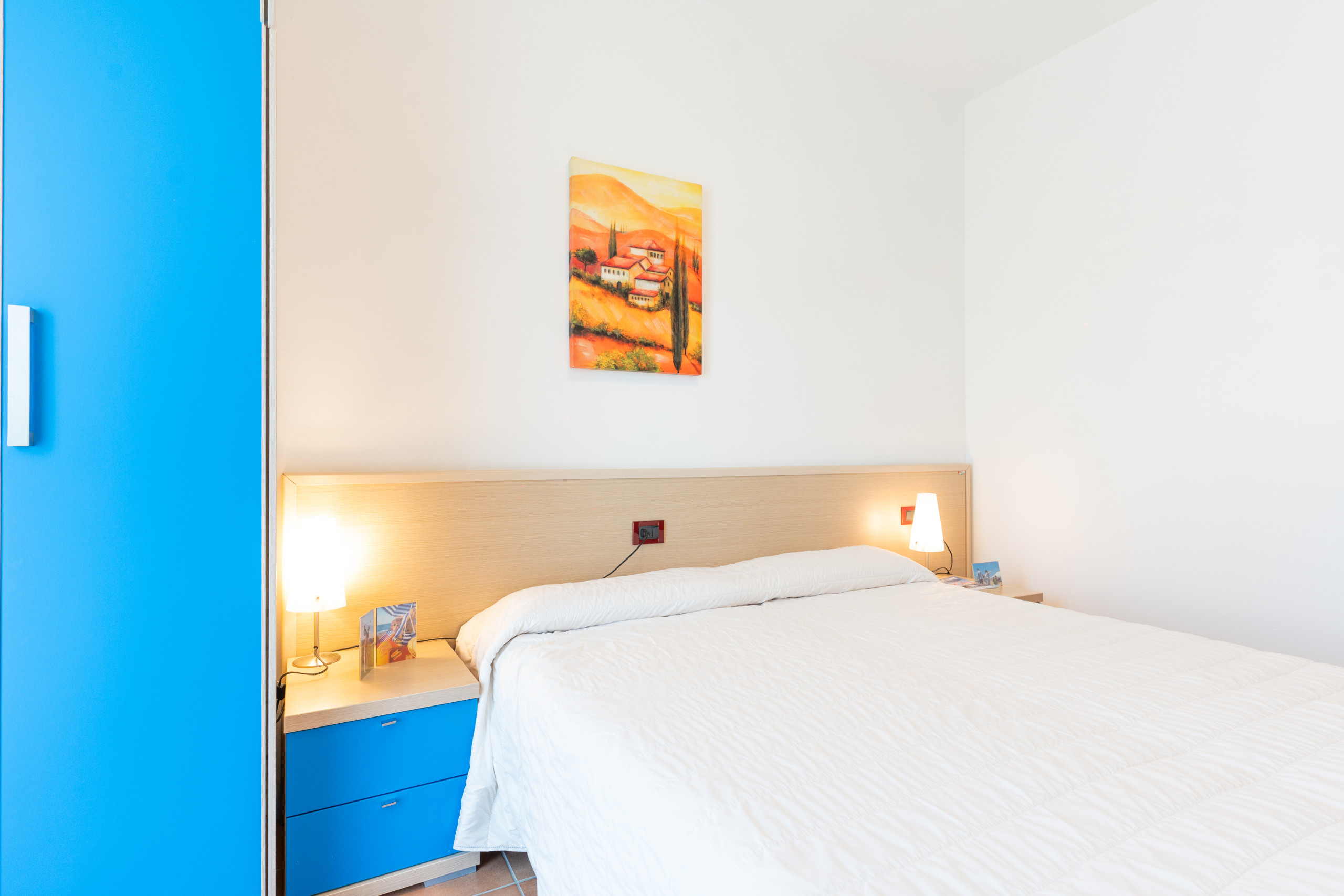 Alle Wohnungen erstrecken sich über eine einzige Ebene, und einige bieten Blick auf den Pool, während andere seitlich gelegen sind. Der Wohnbereich verfügt über eine ausgestattete Küchenecke, Tisch, Stühle und ein französisches Doppelbett-Schlafsofa mit Zugang zum Balkon oder Garten, ideal für Mahlzeiten im Freien. Das Hauptschlafzimmer ist mit einem Doppelbett und einem Einzelbett ausgestattet, während das zweite Schlafzimmer zwei Einzelbetten bietet. Das Badezimmer ist geräumig und mit einer Duschkabine ausgestattet.