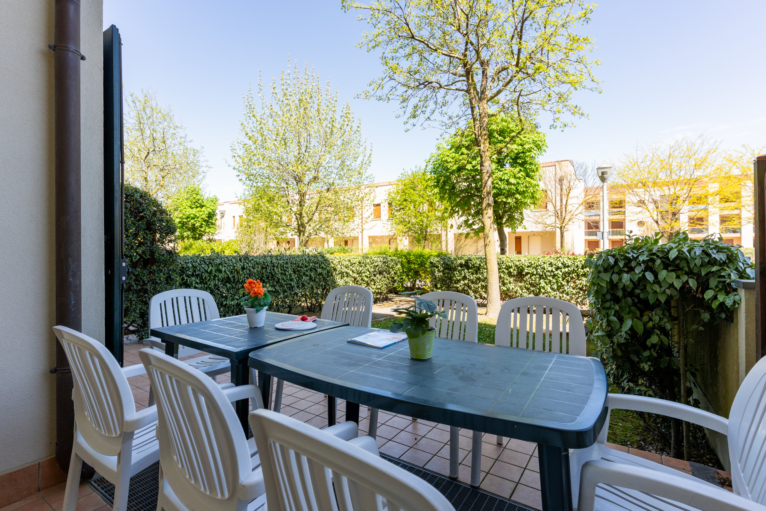 Die gemütlichen Drei-Zimmer-Villen (60 m²) auf zwei Etagen bieten funktionale Räume und die nötige Privatsphäre für einen Familienurlaub. Einige Einheiten verfügen über einen privaten Garten mit möblierter Terrasse, andere über eine komfortable Terrasse mit Gartenmöbeln – perfekt für Frühstück, Mittag- und Abendessen im Freien. Die Ausrichtungen variieren, mit Blick auf den Pool oder den Innenweg, und schaffen so unterschiedliche Urlaubsatmosphären.