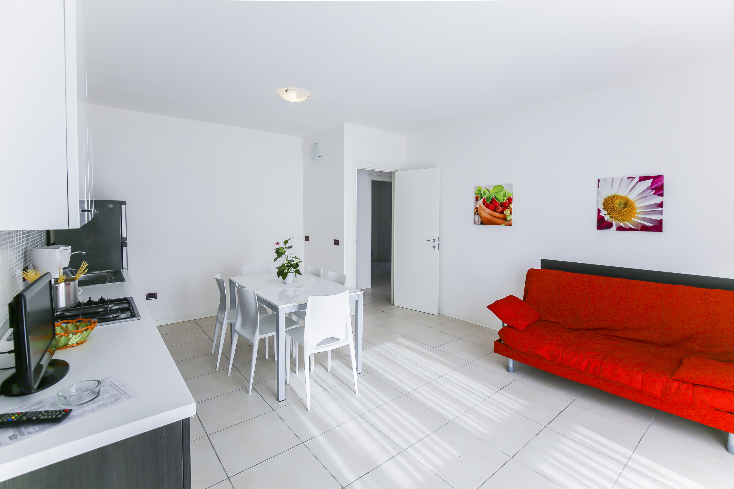 • helles Wohnzimmer mit ausgestatteter Küchenzeile, Esstisch, französischem Doppelbettsofa und Zugang zur Terrasse oder zum Balkon;