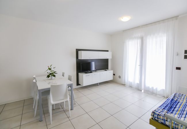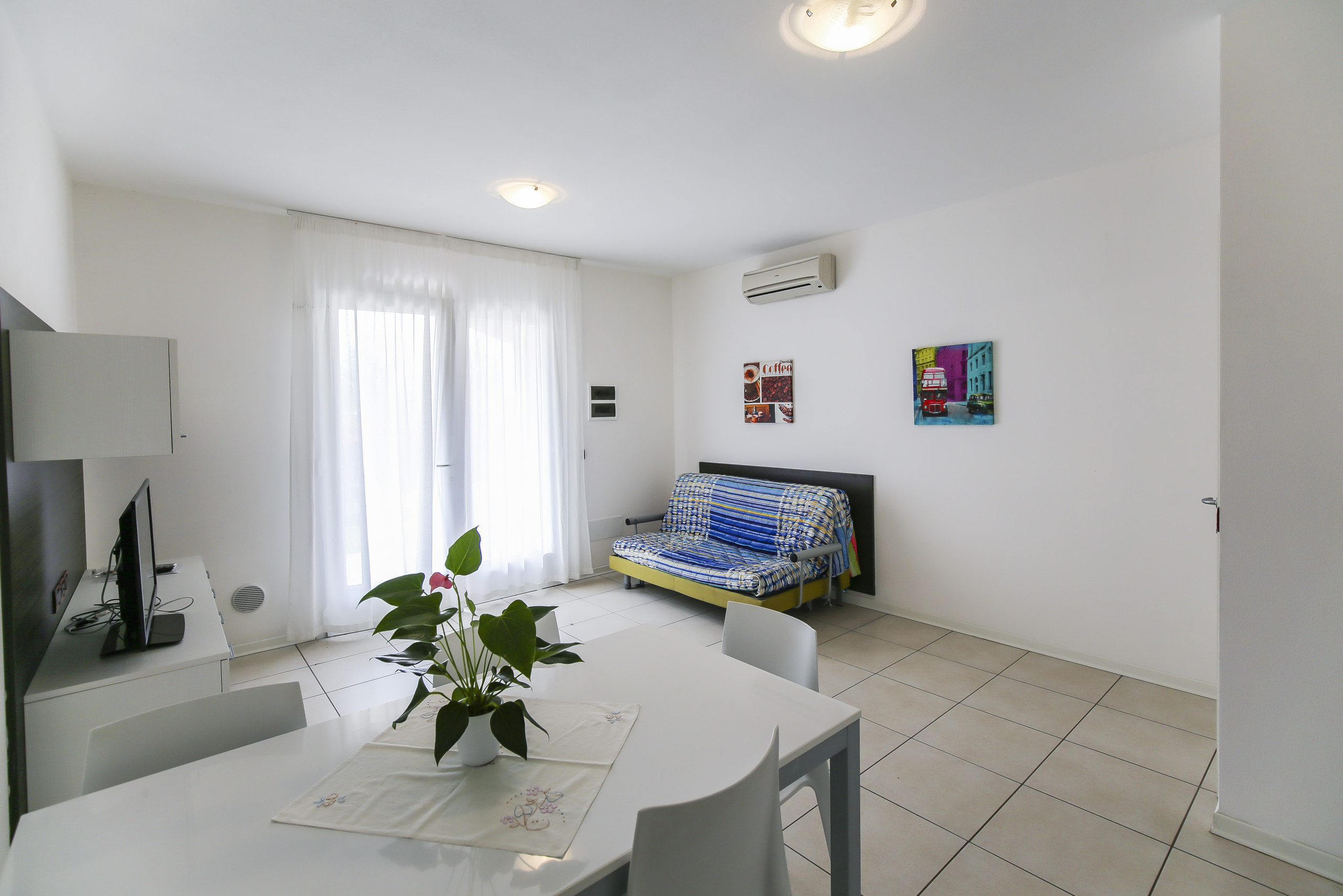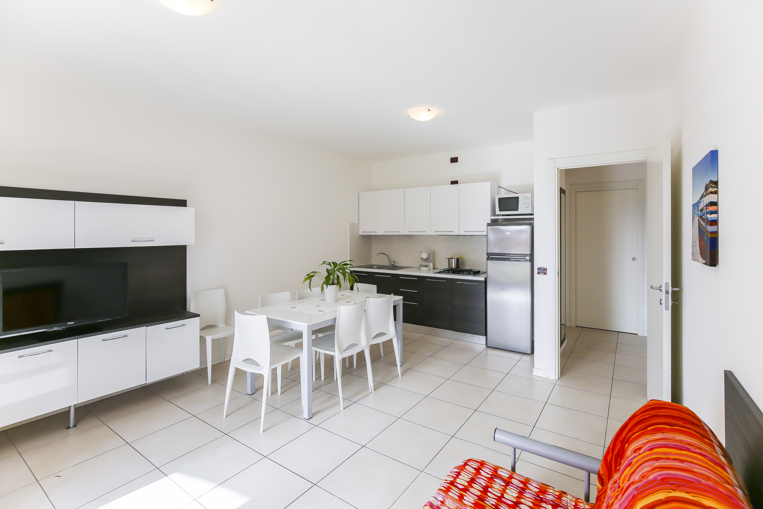 • helles Wohnzimmer mit ausgestatteter Küchenzeile, Esstisch, französischem Doppelbettsofa und Zugang zur Terrasse oder zum Balkon;