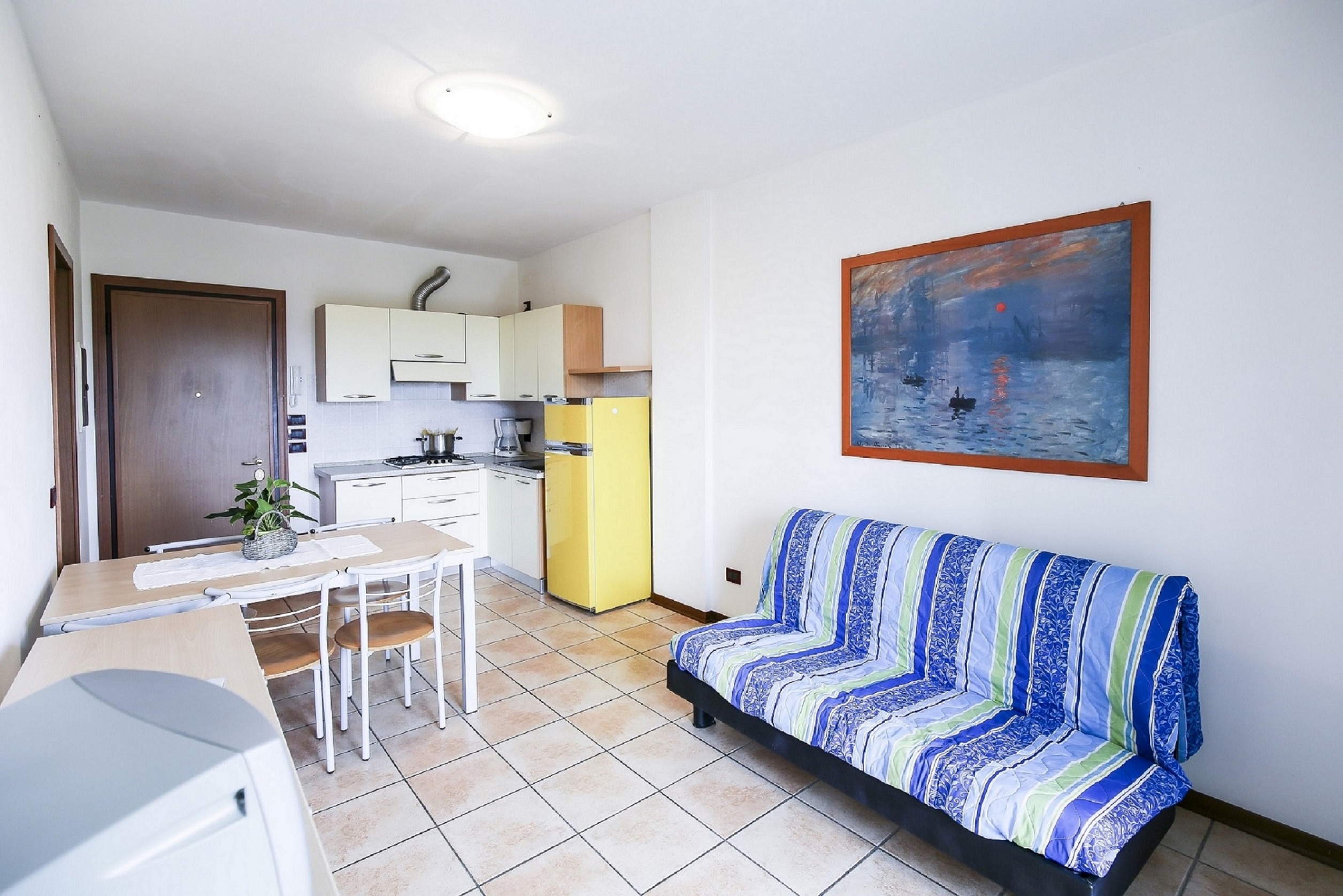 Im Erdgeschoss befindet sich ein Wohnzimmer mit Küchenzeile und einem französischen Doppelbett-Schlafsofa, das eine praktische und einladende Atmosphäre schafft. Über eine Innentreppe gelangt man in das erste Obergeschoss, wo sich ein Schlafzimmer mit Balkon befindet, ausgestattet mit einem Doppelbett und einem Einzelbett, sowie einem geräumigen Badezimmer mit Duschkabine.