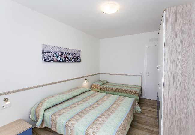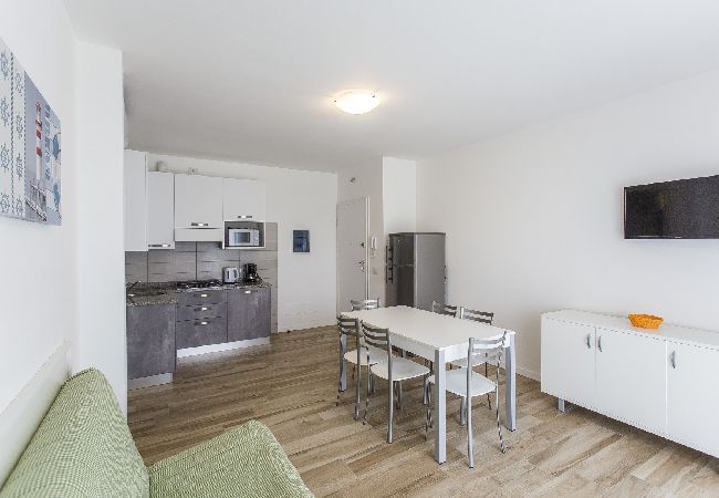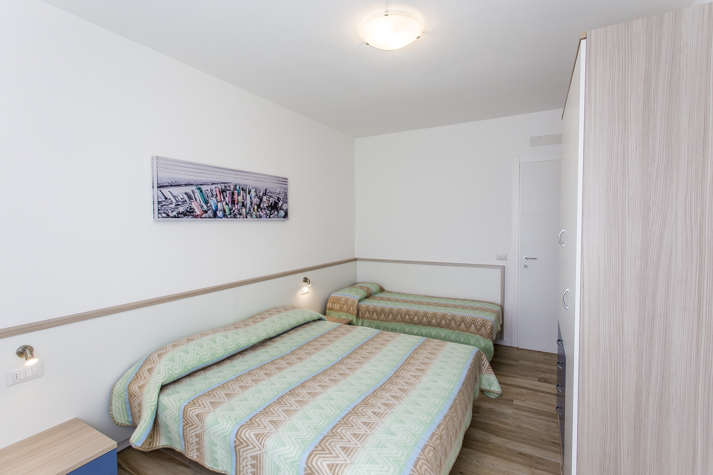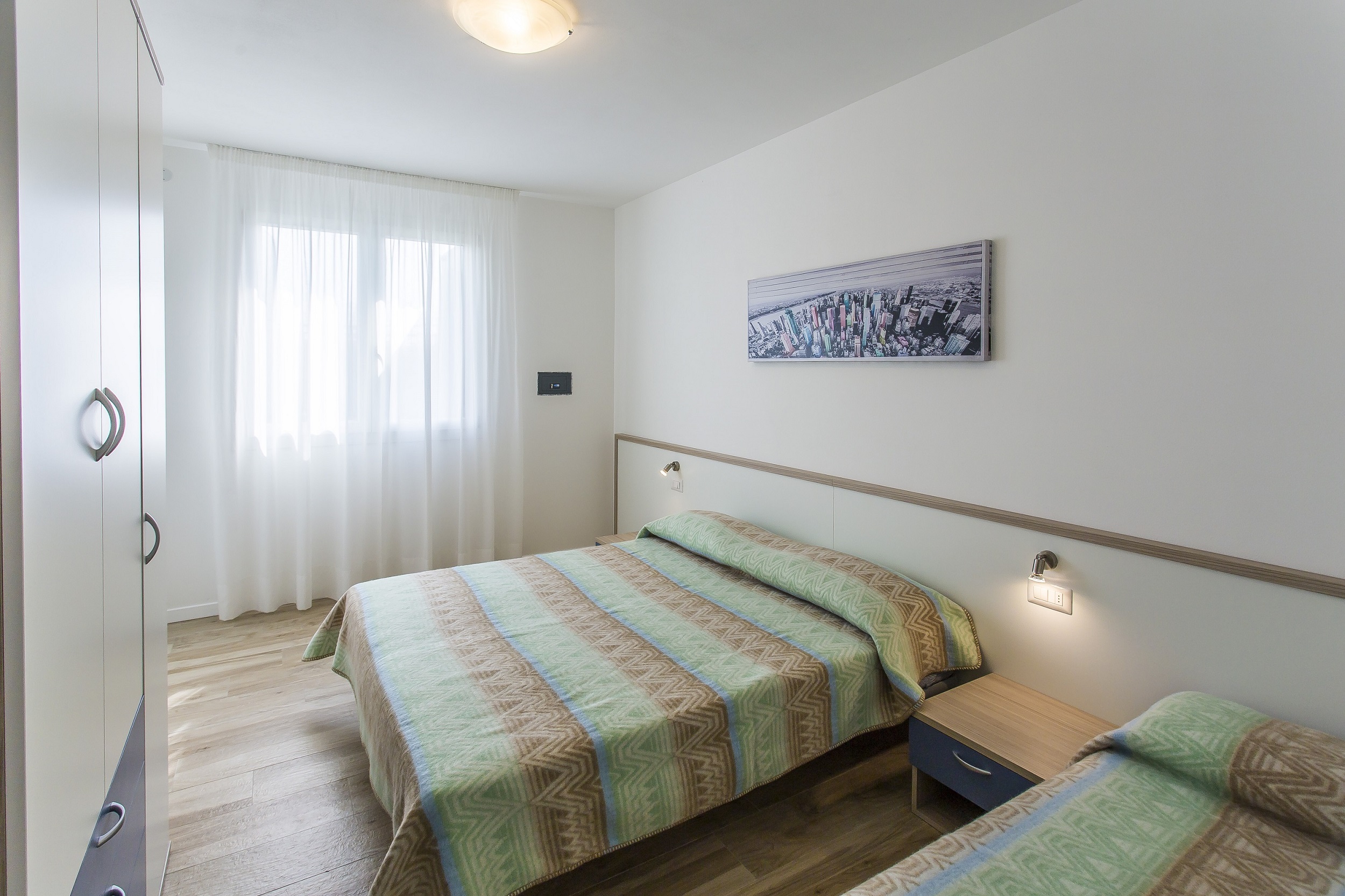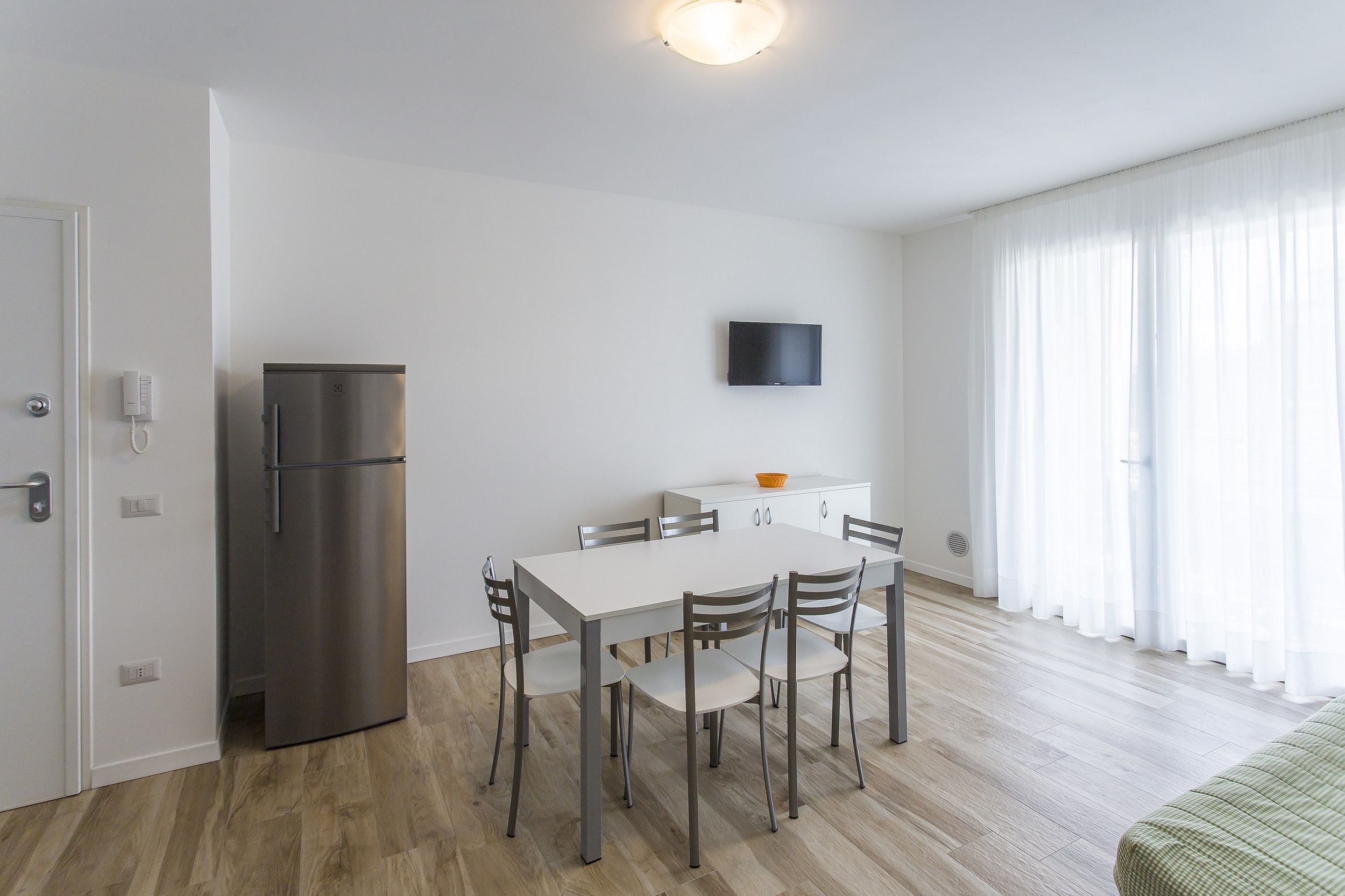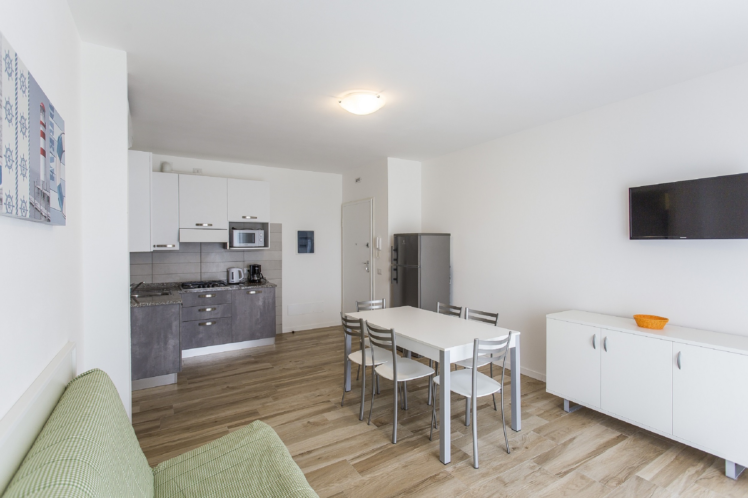 Wohnung fuer 5 Personen, Kochnische und Doppelschlafcouch, Balkon, Badezimmer, Schlafzimmer mit Doppelbett und Zusatzbett, neue Ausstattung, Klima, Safe, Mikrowelle. Die Residence "Mimose" entsteht nur 400 mt. von Strand entfernt, neben dem Einkaufszentrum "La Quercia", bestehend aus 2 oder 3 Zimmer Wohnungen. Schwimmingpool fuer Erwachsene und Kinder, Sonnenterrasse mit Liegenstuehlen und Sonnenschirmen. Tiefgarage oder Stellplatz.Pool oeffnet ab MITTE MAY