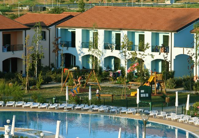 Das Dorf ACACIE liegt nur 200 Meter vom Strand entfernt, in der Nähe eines der Zugänge zum Meer. Es besteht aus 76 Reihenvillen, die auf zwei Etagen verteilt sind und um einen zentralen Pool für Erwachsene und Kinder herum angeordnet sind, umgeben von einer großen Terrasse mit Sonnenliegen und Sonnenschirmen. Im Gemeinschaftsbereich befinden sich ein Kinderspielplatz und eine Grillzone, ideal für Momente der Entspannung und Geselligkeit in Familienkreisen.