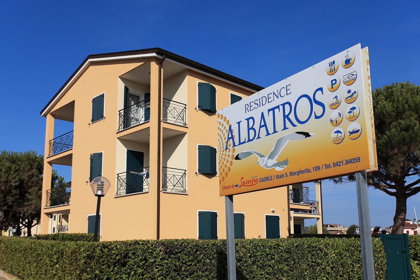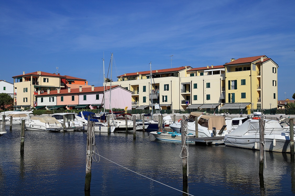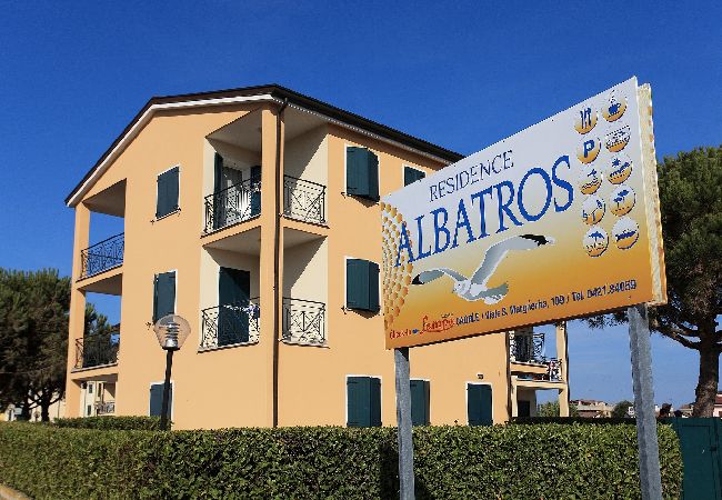 Zweiraumwohnung mit Balkon bestehend aus Schlafzimmer mit Doppelbett, Wohnraum mit Kochnische und Doppelschlafcouch, Badezimmer. ALBATROS EST ist eine Ferienanlage mit Schwimmbad und Aufzug (nur im Treppenhaus E) und befindet sich am Jachthafen "Darsena dell'Orologio" in der Nähe von der Altstadt, 800 Meter vom Strand. Es besteht aus Wohnungen verschiedener Größen, einige mit Garten, einige ohne oder mit Balkon. Jede hat einen privaten Parkplatz dabei.