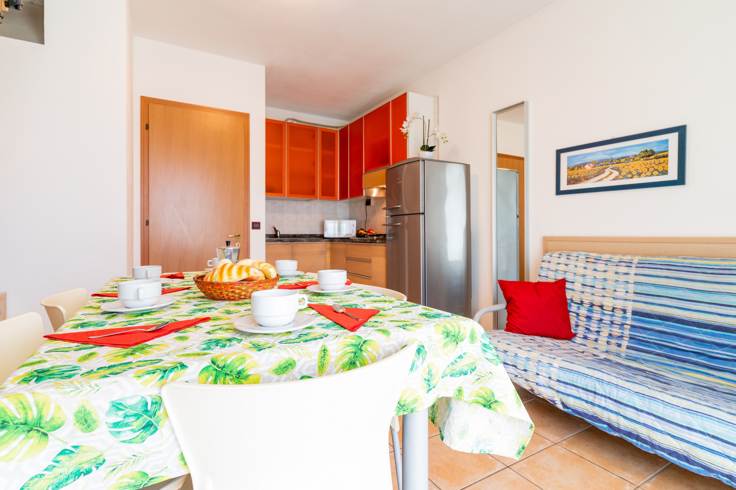 • helles Wohnzimmer mit ausgestatteter Küchenzeile, Esstisch, französischem Doppelbettsofa und Zugang zur Terrasse oder zum Balkon;