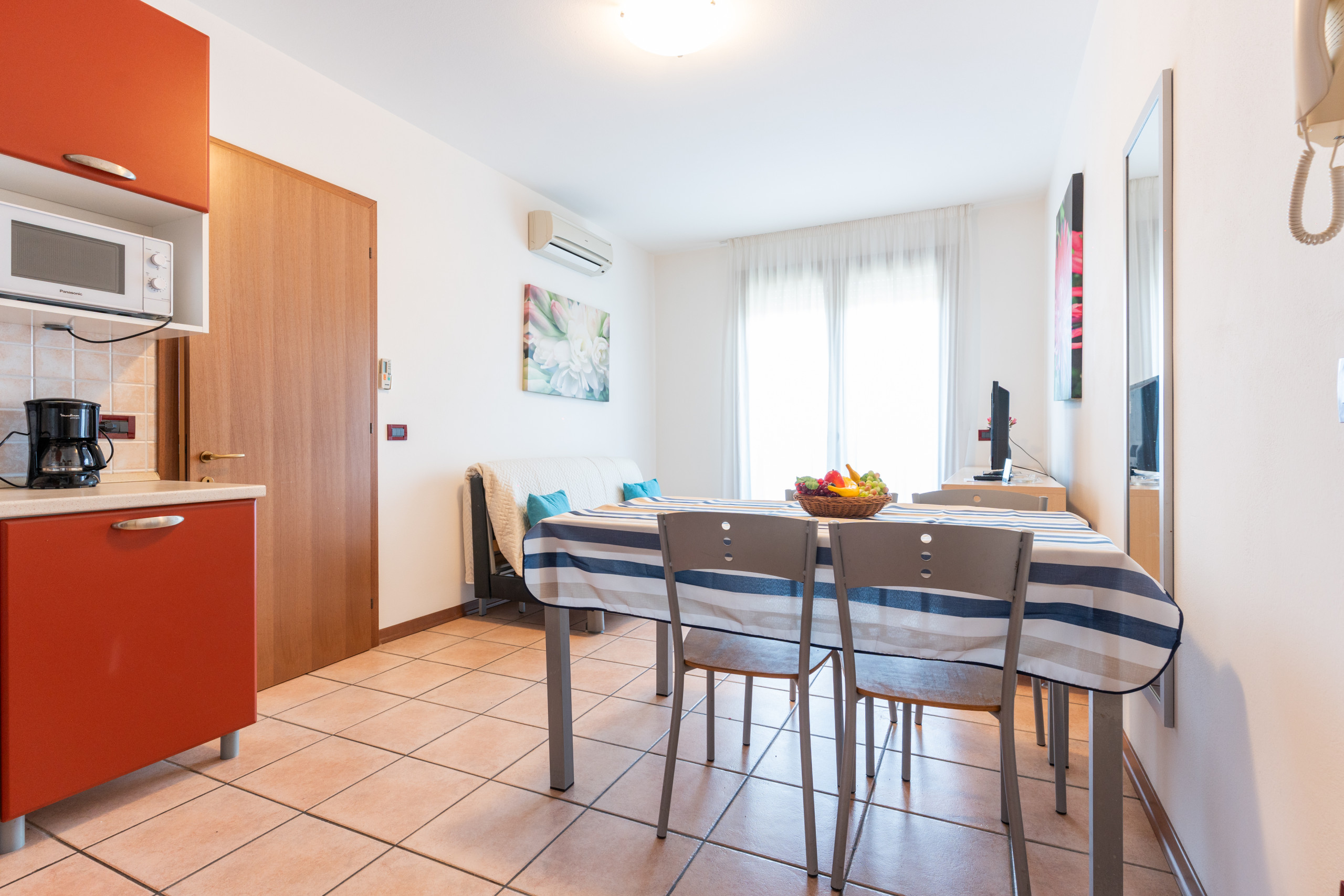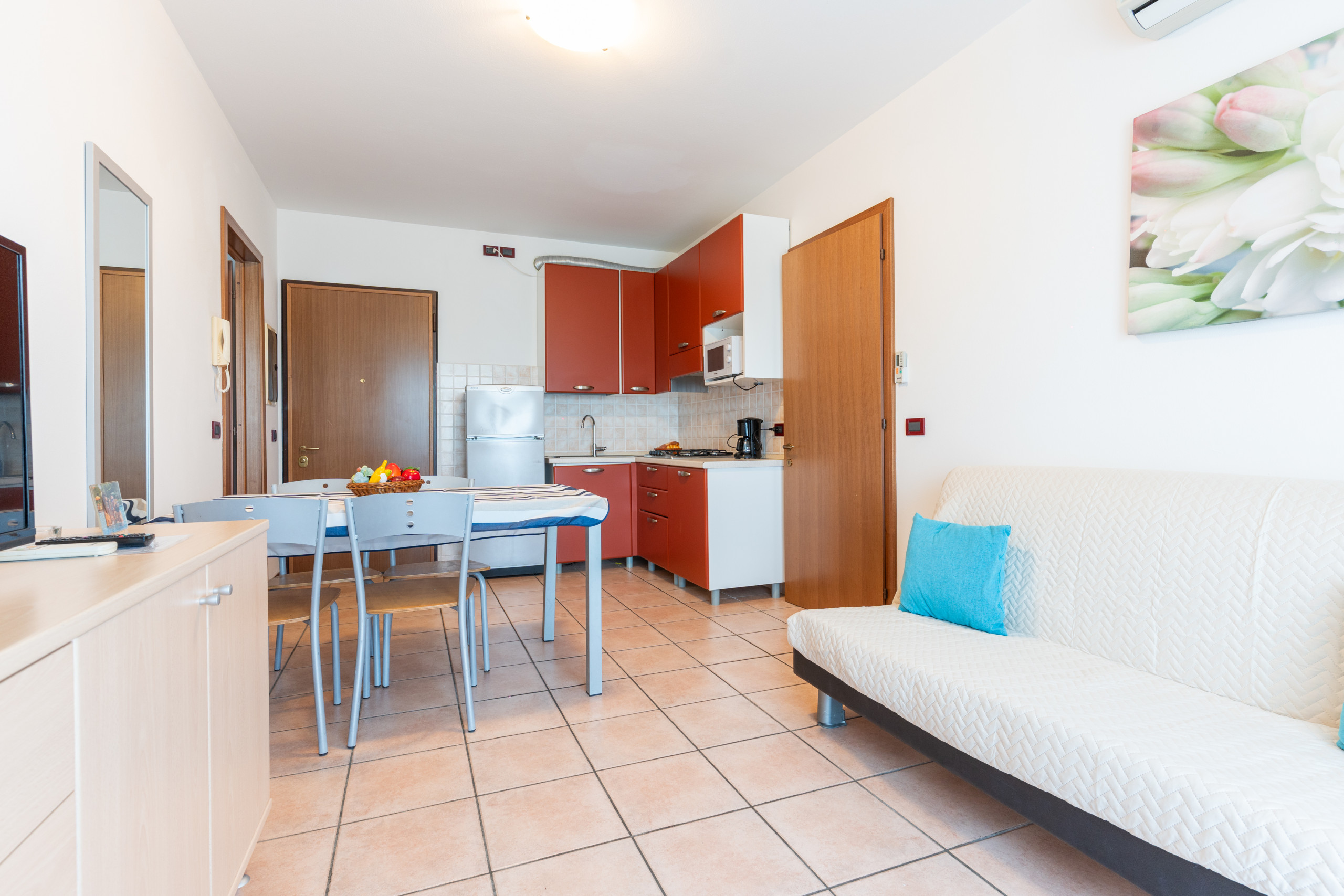 • helles Wohnzimmer mit ausgestatteter Küchenzeile, Esstisch, französischem Doppelbettsofa und Zugang zur Terrasse oder zum Balkon;