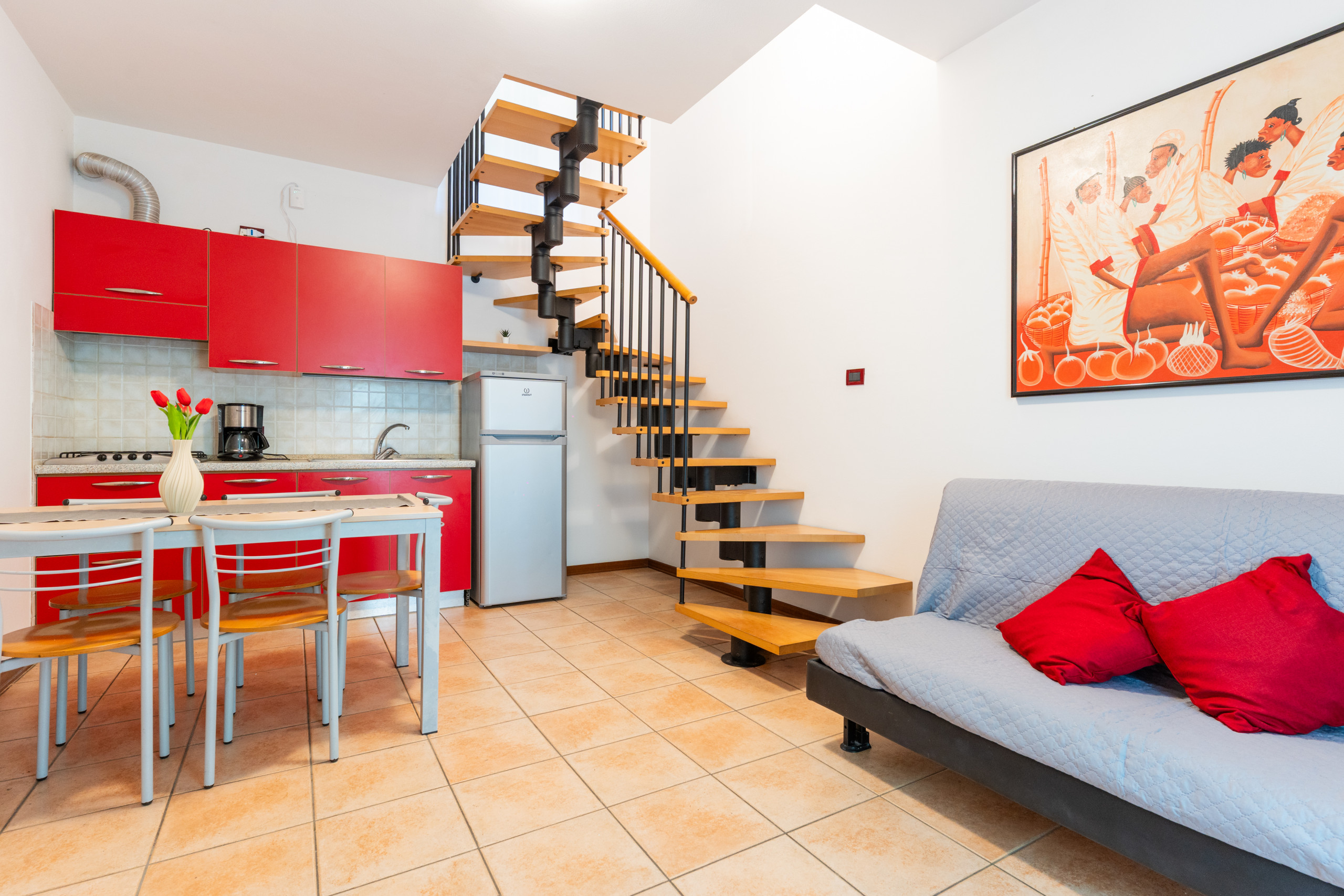 Im Erdgeschoss finden Sie ein Wohnzimmer mit Küchenzeile und einem bequemen französischen Doppelbettsofa, ideal zum Entspannen nach einem Urlaubstag. Über eine Innentreppe gelangt man in ein Schlafzimmer mit Balkon, ausgestattet mit einem Doppelbett und einem Einzelbett, sowie einem geräumigen Badezimmer mit Duschkabine.