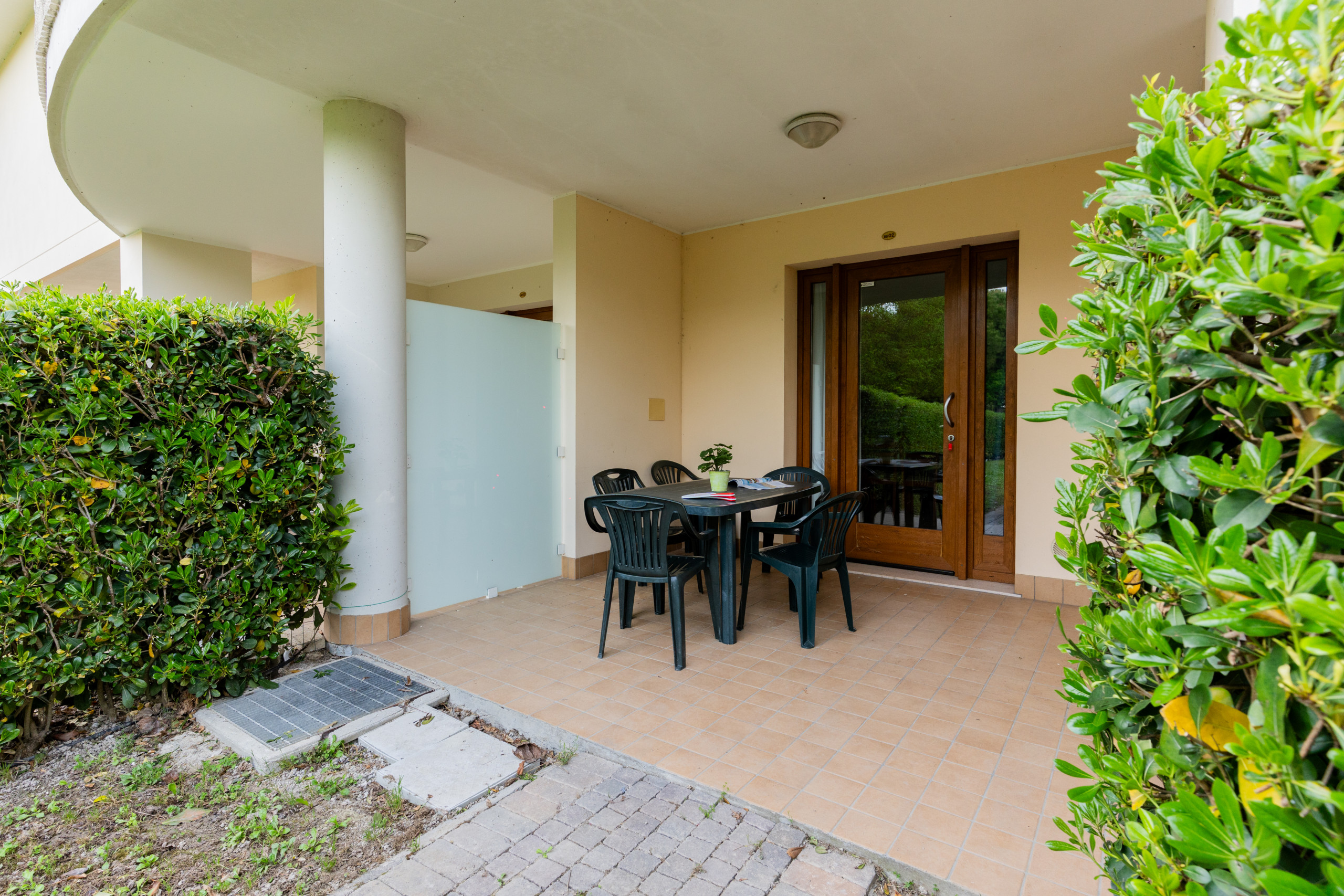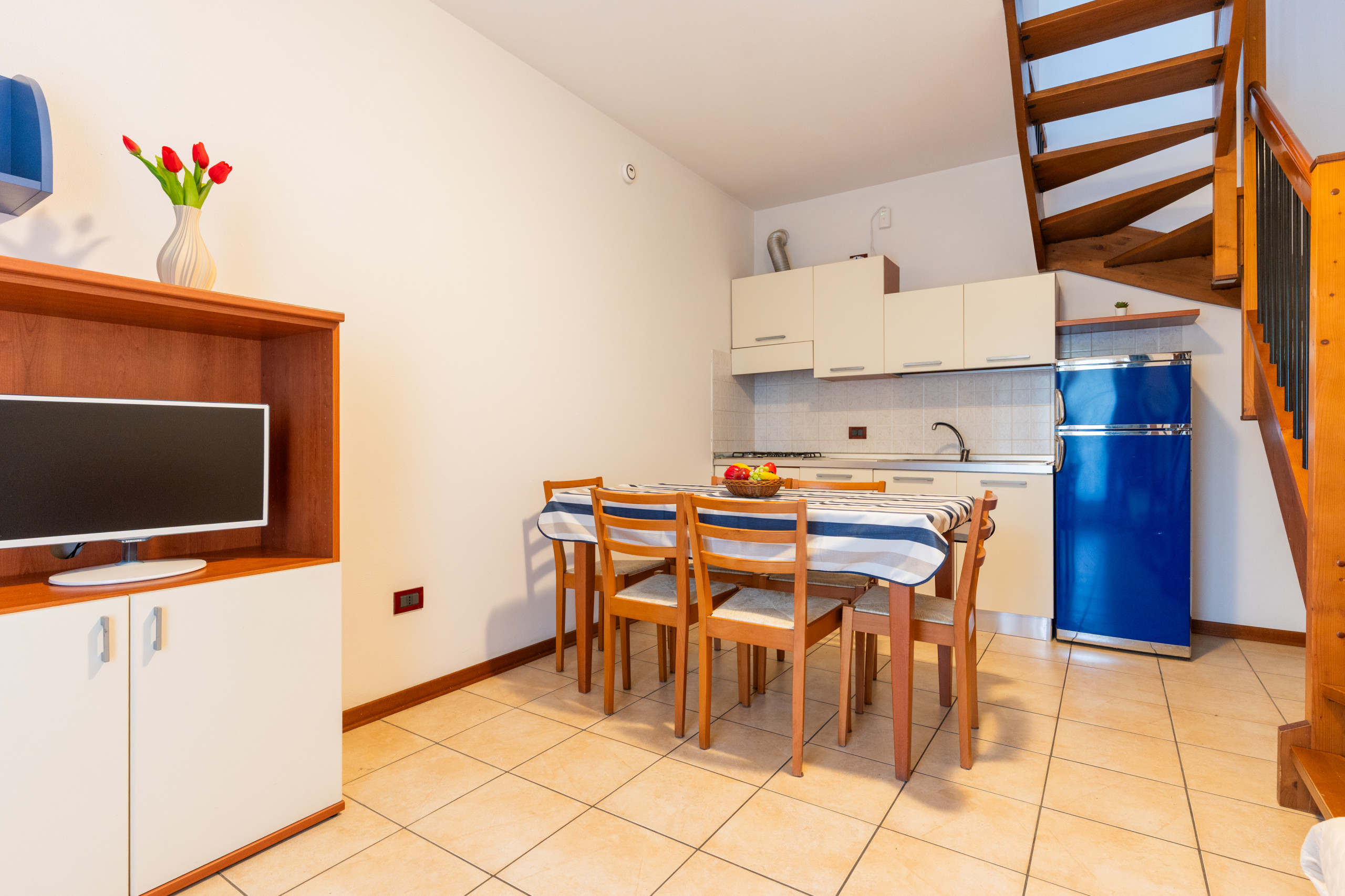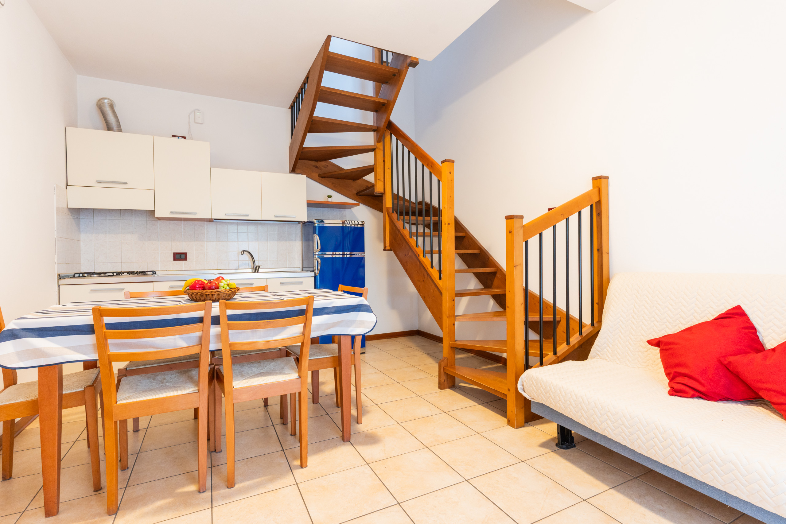 Die einladenden Zweizimmerwohnungen mit 45 m², verteilt auf zwei Etagen, verfügen über einen Garten oder eine geflieste Terrasse und eine bequeme, mit Tisch und Außenstühlen ausgestattete Veranda: perfekt für Mahlzeiten im Freien. Jede Villetta kann verschiedene Ausblicke genießen: auf den Pool oder den Innenhofweg.
