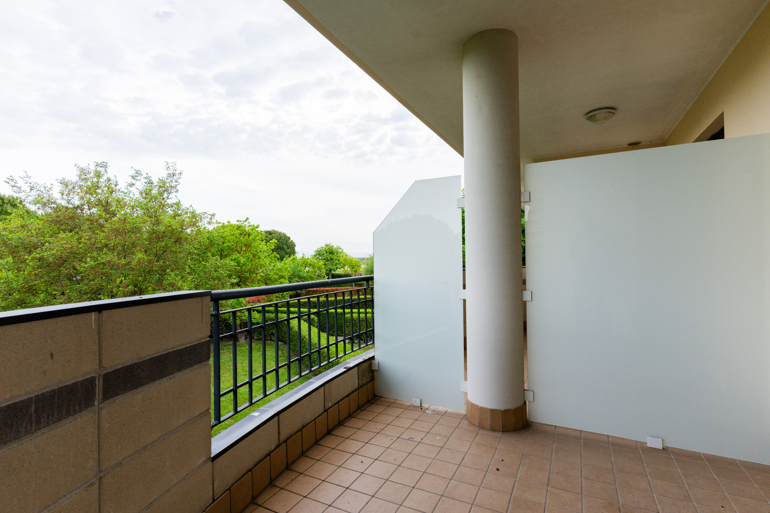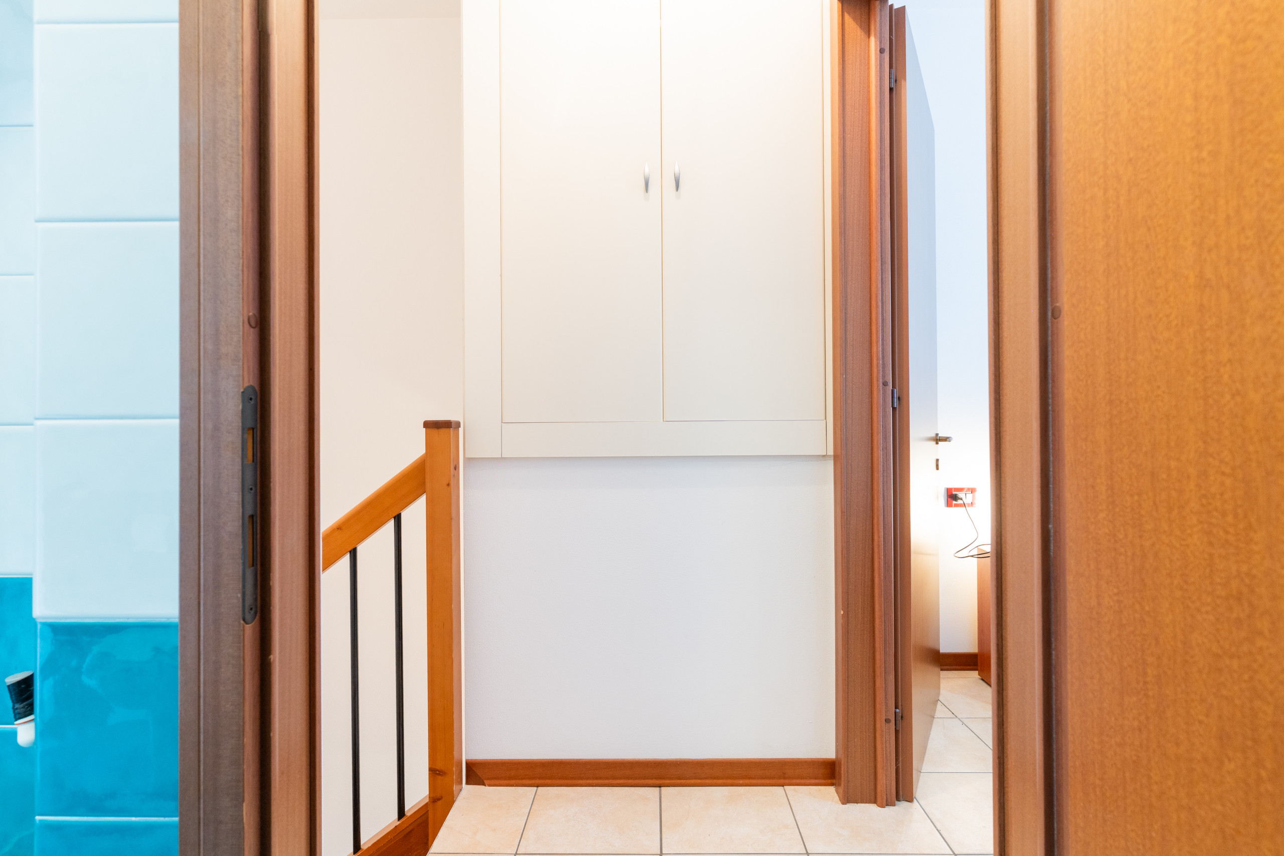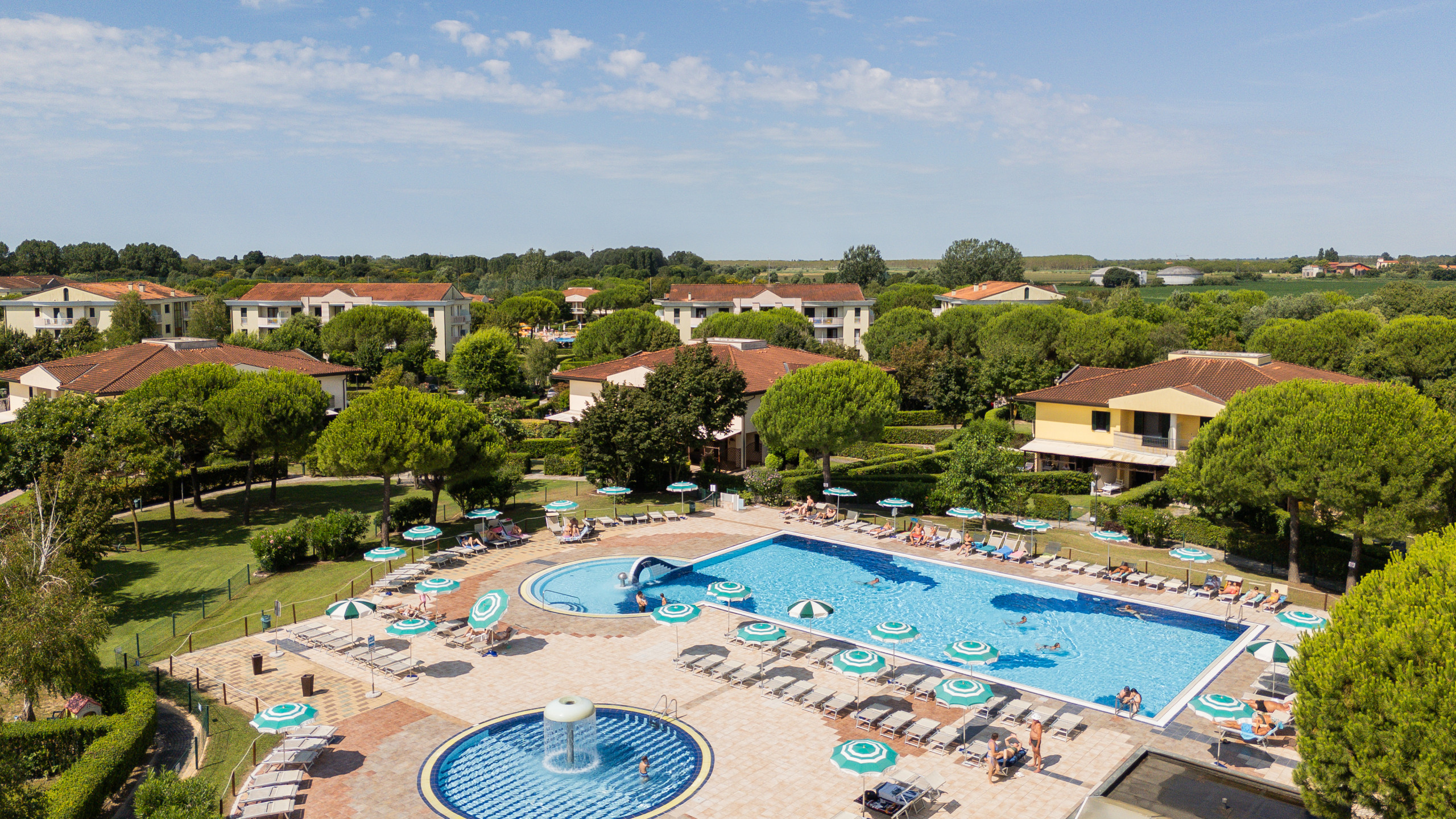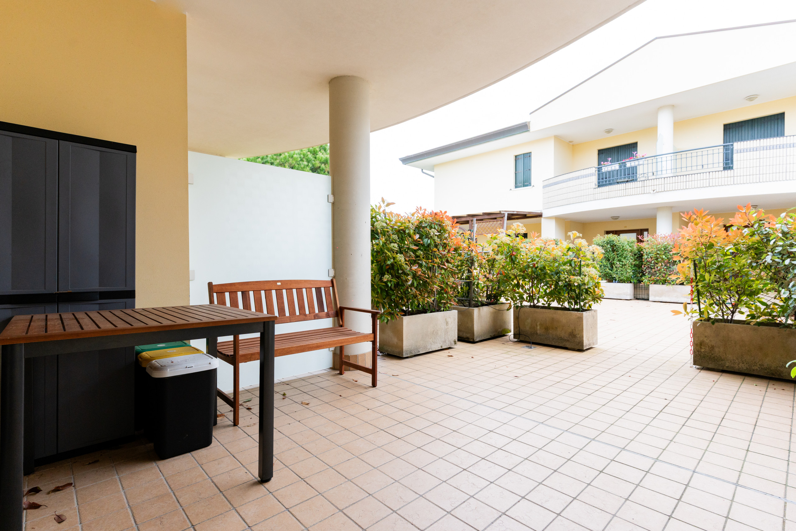 Die einladenden Zweizimmerwohnungen mit 45 m², verteilt auf zwei Etagen, verfügen über einen Garten oder eine geflieste Terrasse und eine bequeme, mit Tisch und Außenstühlen ausgestattete Veranda: perfekt für Mahlzeiten im Freien. Jede Villetta kann verschiedene Ausblicke genießen: auf den Pool oder den Innenhofweg.