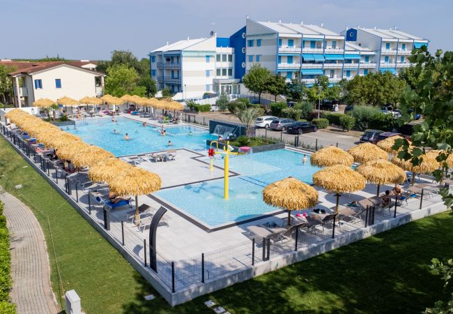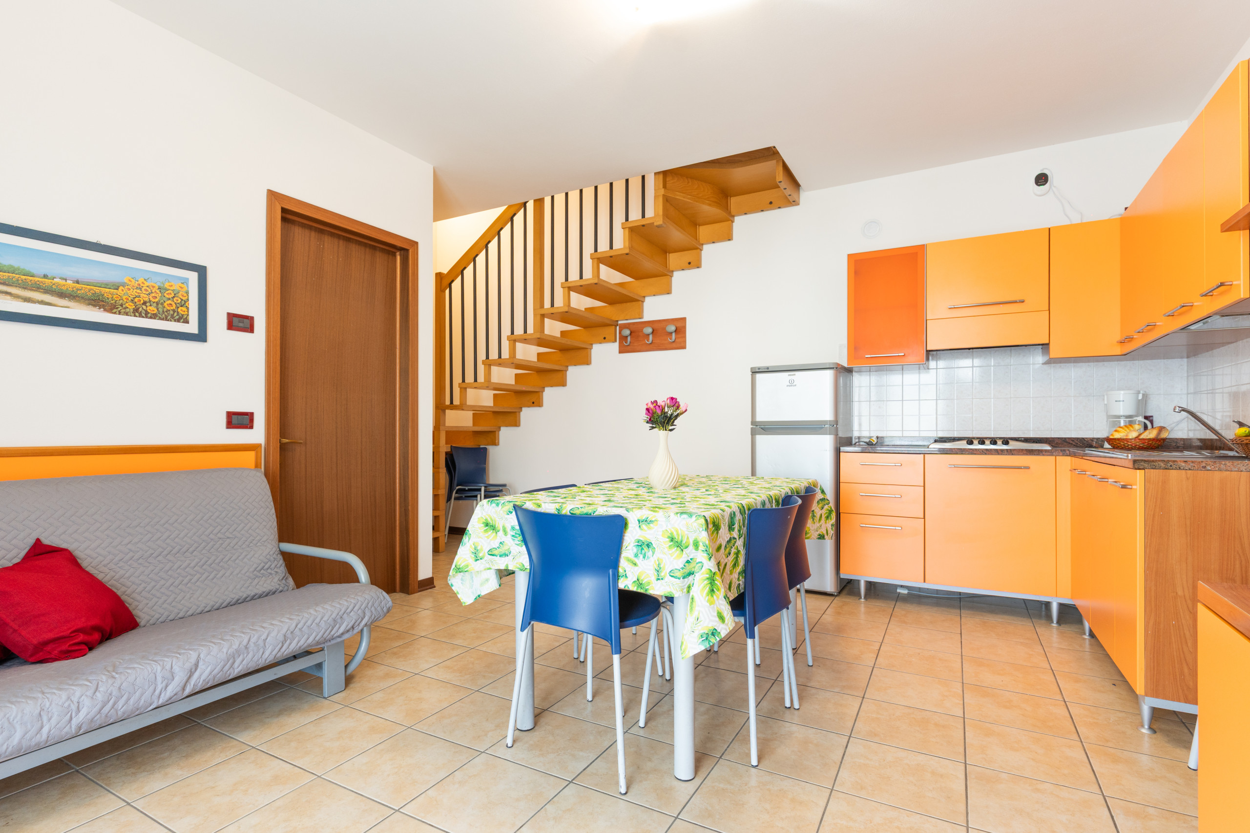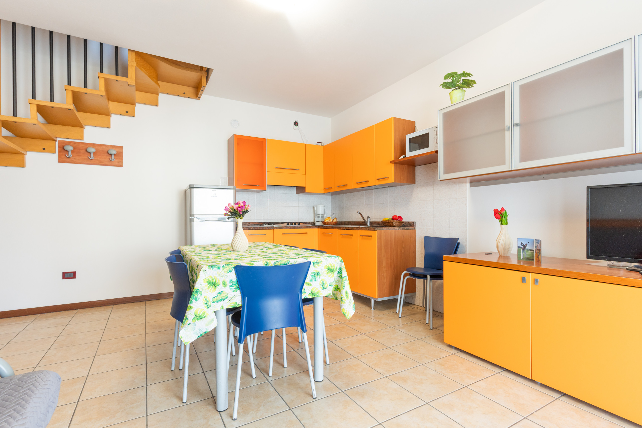 Die einladenden Dreizimmerwohnungen mit 62 m², die sich über zwei Etagen erstrecken, verfügen über einen privaten Garten und eine möblierte Terrasse, ideal für Frühstück, Mittagessen und Abendessen im Freien. Jede Villetta genießt unterschiedliche Ausrichtungen mit Blick auf den Pool, den Innengarten oder die Hauptallee.
