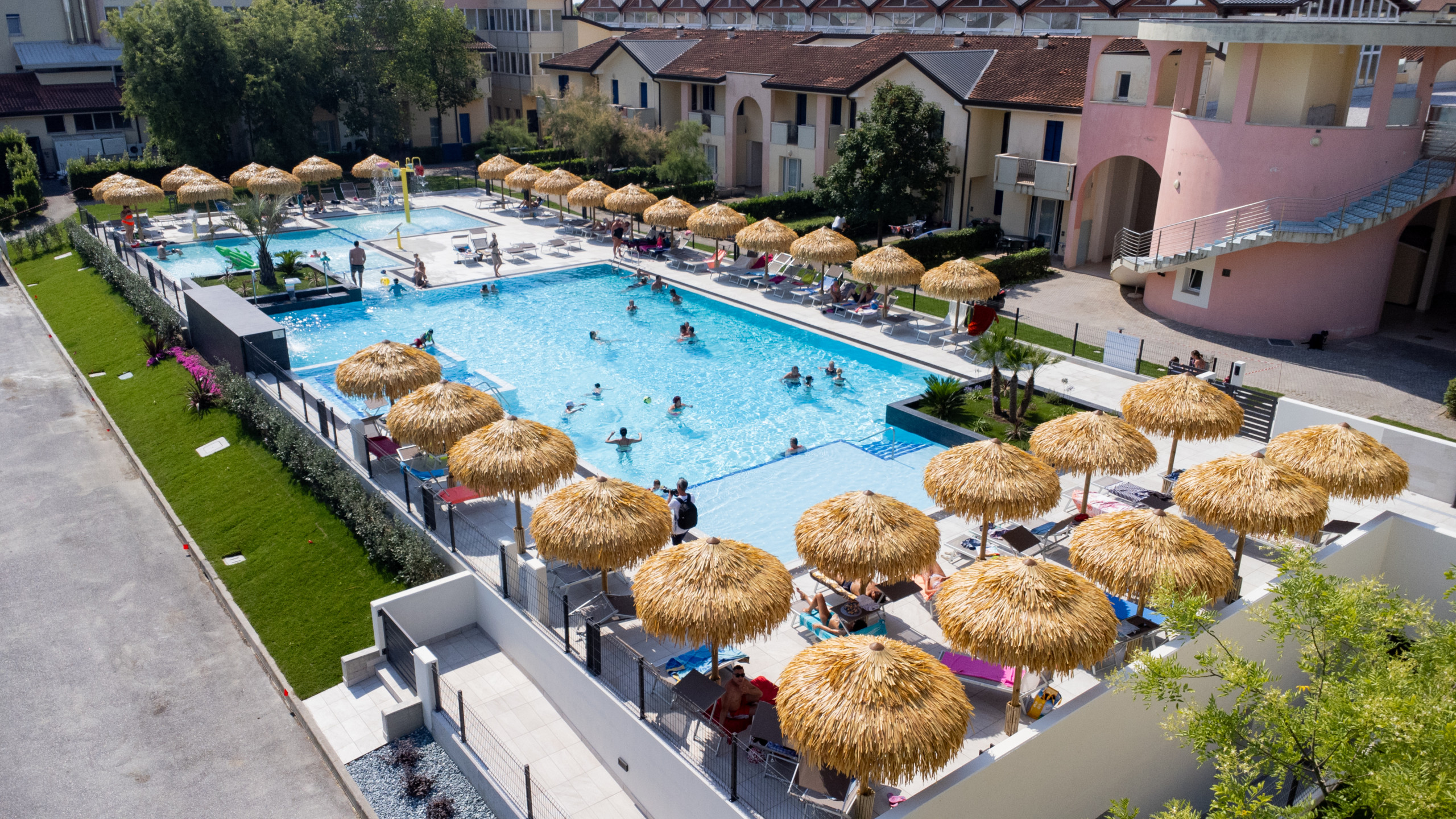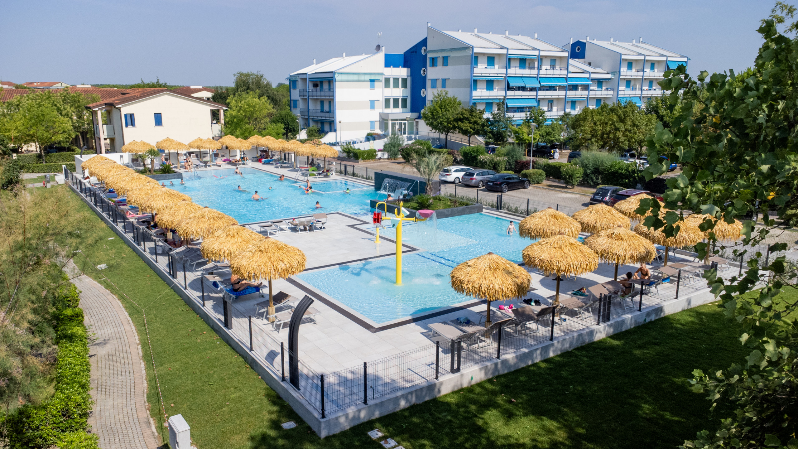 Um den Aufenthalt noch angenehmer zu machen, ist der herrliche Pool mit Wasserspielen und Wasserfall, umgeben von einem großzügigen Solarium, das mit Sonnenschirmen und Liegen ausgestattet ist und perfekt zum Entspannen unter der Sonne ist.