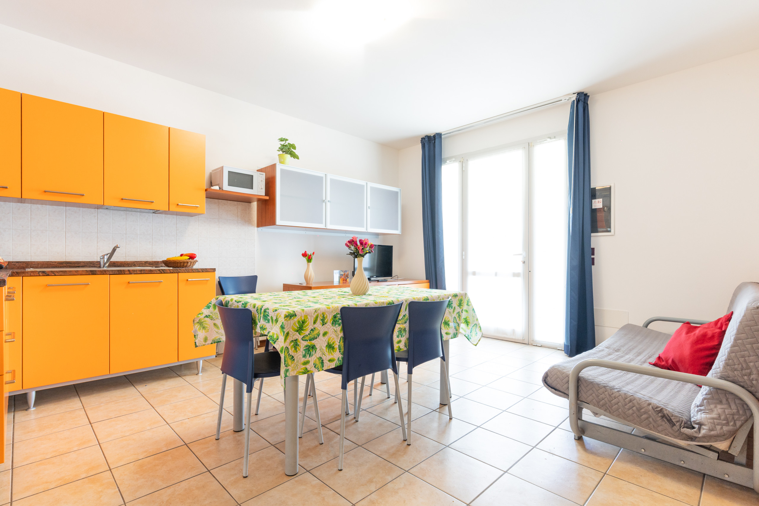 • helles Wohnzimmer mit ausgestatteter Küchenzeile, Esstisch, französischem Doppelbettsofa und Zugang zur Terrasse oder zum Balkon;