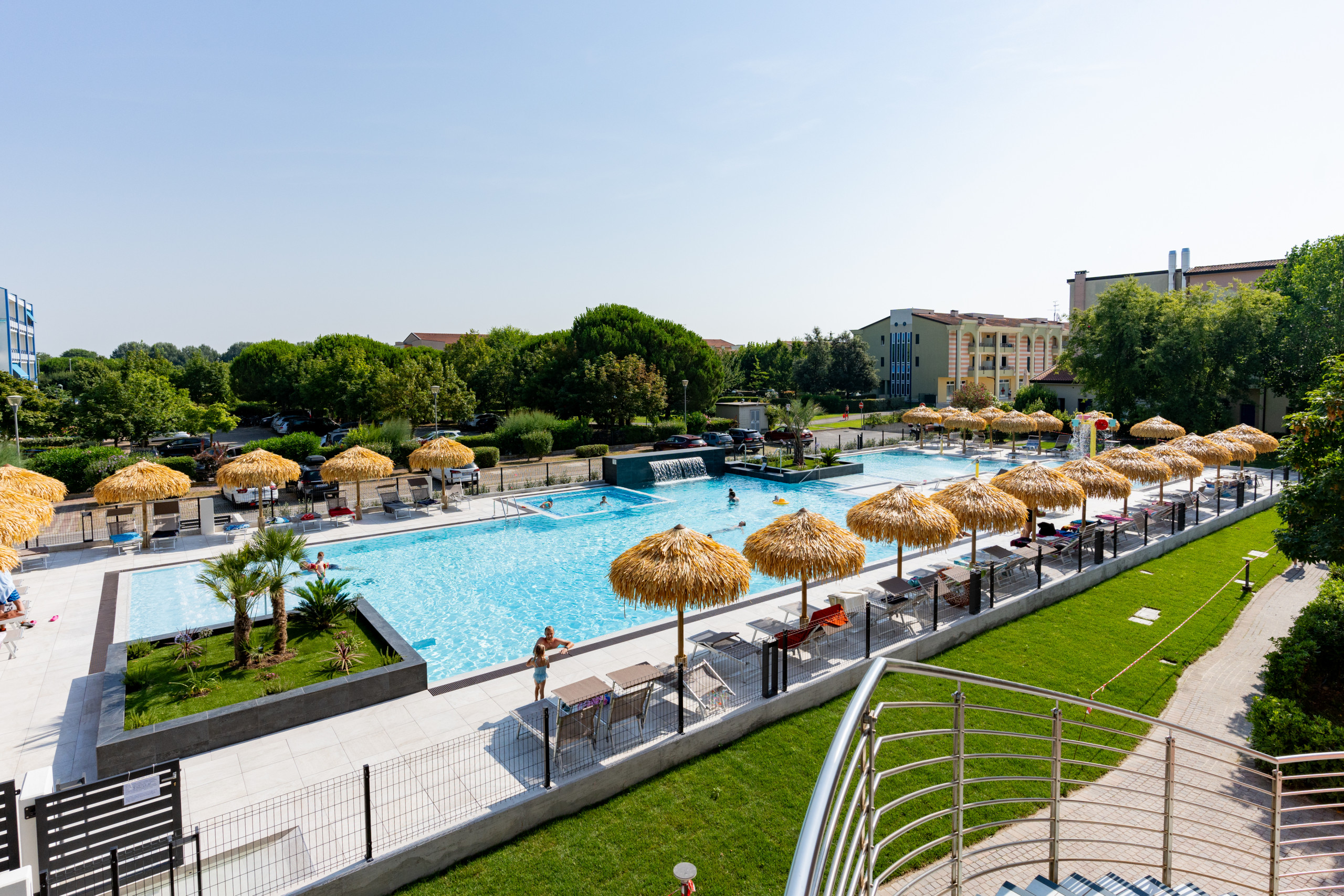 Die Residenz bietet einen wunderschönen Pool mit Wasserspielen und Wasserfall, umgeben von einem großen Solarium, das mit Sonnenschirmen und Liegen ausgestattet ist, ideal für Momente der Entspannung und Unterhaltung. Vervollständigt wird das Erlebnis durch den nahe gelegenen Strand mit goldenem Sand, der weite Räume zum Entspannen oder Spielen mit der Familie bietet. Für Kinder fehlt es nicht an Unterhaltung: Strandspiele tagsüber und Abendshows in der Happy Arena für fröhliche Abende.