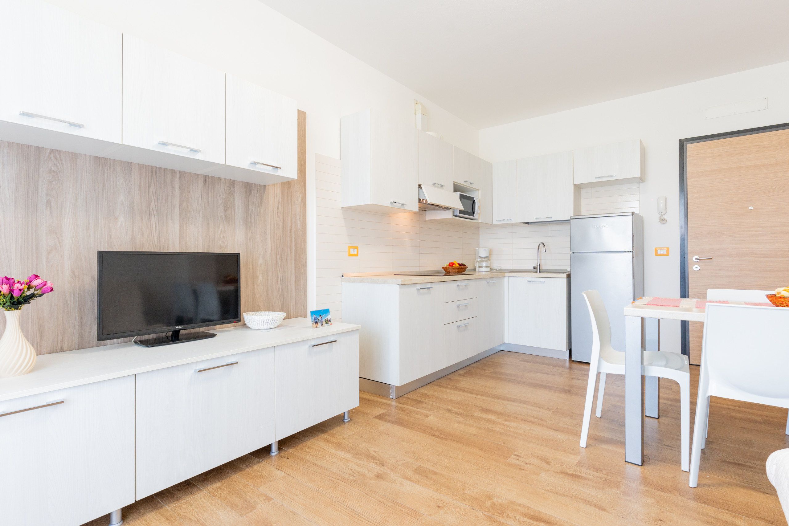 Jede Wohnung ist mit Klimaanlage, SAT-TV, Safe, Wasserkocher, Mikrowelle, Standkühlschrank und allem Notwendigen zum Kochen ausgestattet.