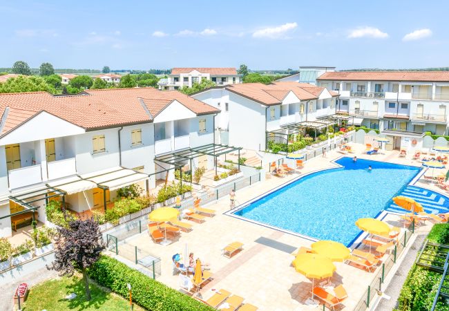 Die Wohnanlage entwickelt sich um einen großen zentralen Bereich mit einem Schwimmbecken für Erwachsene und Kinder, umgeben von einem hellen Solarium mit Sonnenliegen und Sonnenschirmen. Diese Anordnung schafft einen einladenden und privaten Innenhof, in dem Ruhe und Eleganz sich mit der Sommeratmosphäre von Lido Altanea verbinden.