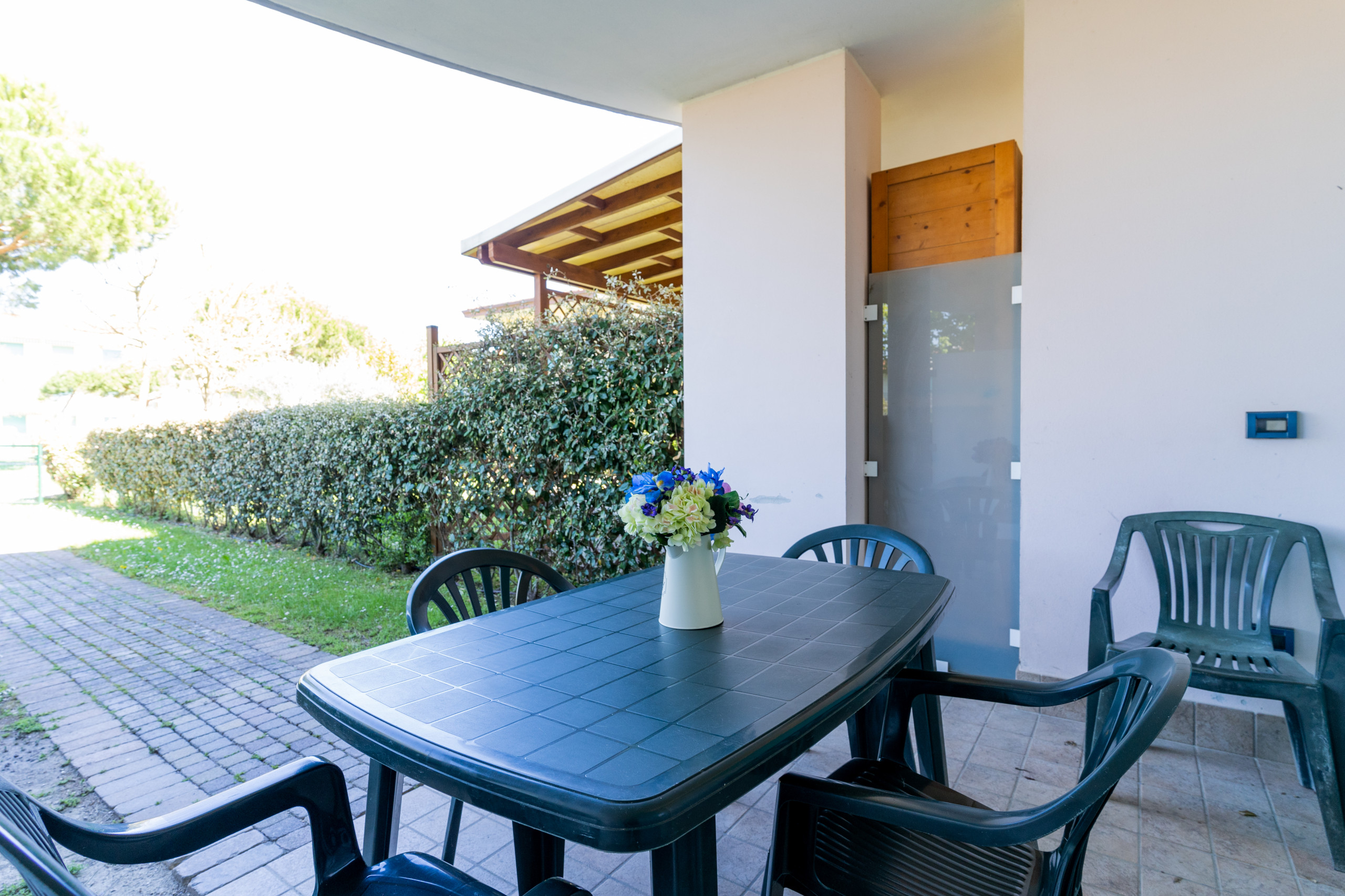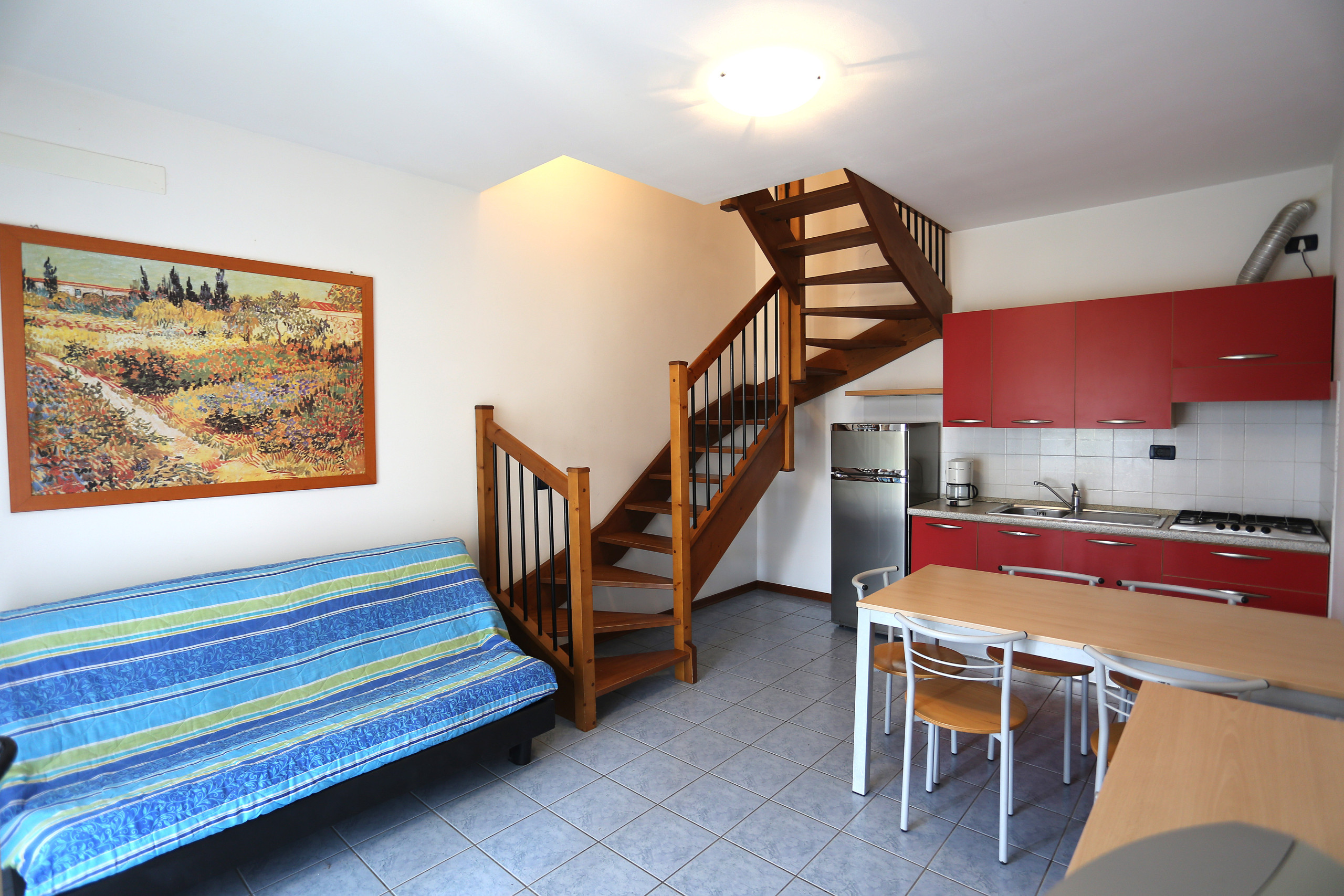 Die Zweizimmerwohnungen an den CARPINI (50 m²) sind gemütlich und funktional, ideal für einen komfortablen Aufenthalt. Auf zwei Etagen verteilt, bieten sie einen Garten und eine möblierte Veranda, perfekt für Mahlzeiten im Freien.