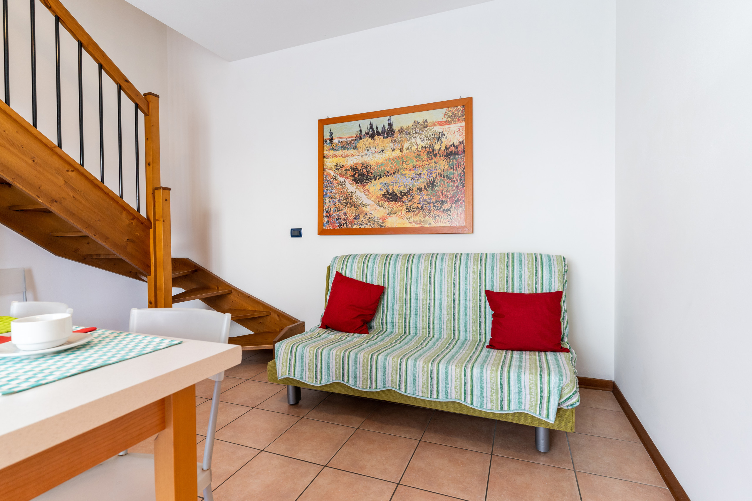 Die Villen, geräumig und hell, erstrecken sich über zwei Etagen und verfügen über möblierte Außenbereiche, die perfekt für Mahlzeiten und Abendessen im Freien sind. Im Erdgeschoss befinden sich ein Wohnzimmer mit Küchenzeile, ein Doppelbettsofa und ein Badezimmer mit Duschkabine, während im Obergeschoss ein Doppelzimmer mit Einzelbett, ein zweites Zimmer mit Einzelbetten und ein geräumiges Badezimmer mit Dusche und einem großen Balkon auf Sie warten.