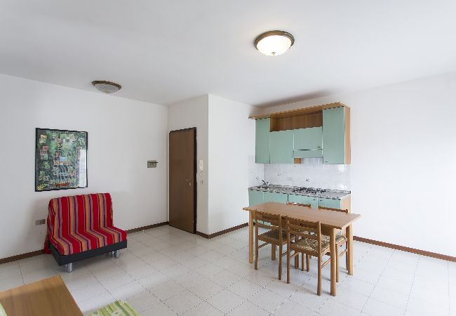 Wohnung im Erdgeschoss, mit Doppelzimmer plus Einzelbett, Doppelschlafcauch im Wohn-Esszimmer mit Kochecke und Badezimmer. Dieses neu erbaute, aus 60 Wohneinheiten bestehende Feriendorf mit Schwimmbad liegt 530 Meter vom Strand entfernt in der Naehe der Piazza Mazzini in Lido di Jesolo. Kein Strandservice. Es bietet Ferienwohnungen mit Pool (fuer Erwachsene und Kinder), Sonnenterrasse mit Liegen und Sonnenschirmen. Die Wohnungen verschiedenster Typologien sind alle mit Wasch- und Spuelmaschine, Mikrowelle, Hochkuehlschrank, Klimaanlage, Foehn, SAT LED-TV, WLAN ausgestattet. 1 Aussenstellplatz pro Wohnung inklusive. Auf Anfrage und gegen Bezahlung Stellplaetze in der Garage. Hausmeisterservice.
