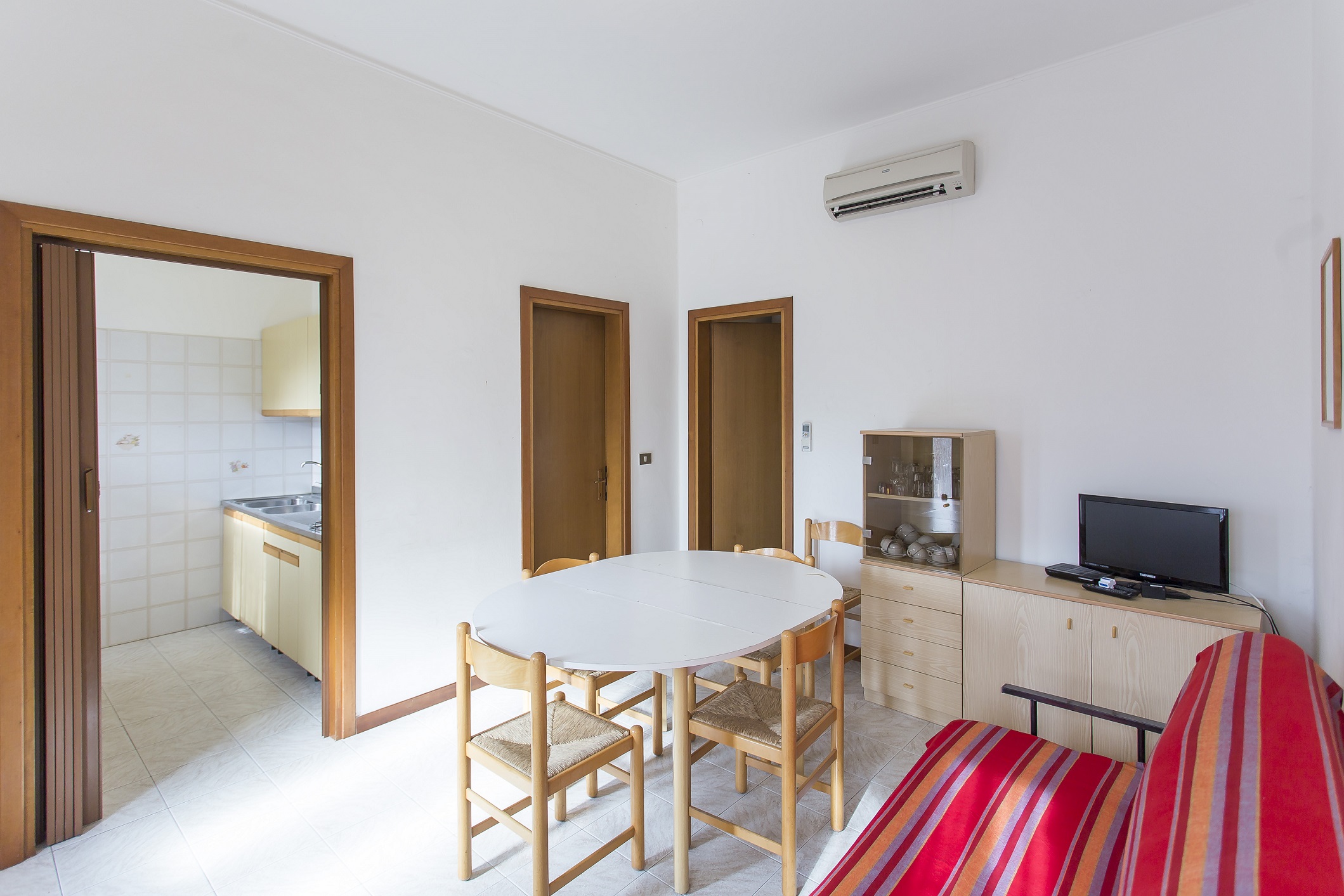 Wohnung im Erdgeschoss, mit Doppelzimmer plus Einzelbett, Schlafzimmer mit 2 Einzelbetten, Doppelschlafcauch inm Wohn-Esszimmer mit Kochecke und Badezimmer. Dieses neu erbaute, aus 60 Wohneinheiten bestehende Feriendorf mit Schwimmbad liegt 530 Meter vom Strand entfernt in der Naehe der Piazza Mazzini in Lido di Jesolo. Kein Strandservice. Es bietet Ferienwohnungen mit Pool (fuer Erwachsene und Kinder), Sonnenterrasse mit Liegen und Sonnenschirmen. Die Wohnungen verschiedenster Typologien sind alle mit Wasch- und Spuelmaschine, Mikrowelle, Hochkuehlschrank, Klimaanlage, Foehn, SAT LED-TV, WLAN ausgestattet. 1 Aussenstellplatz pro Wohnung inklusive. Auf Anfrage und gegen Bezahlung Stellplaetze in der Garage. Hausmeisterservice.