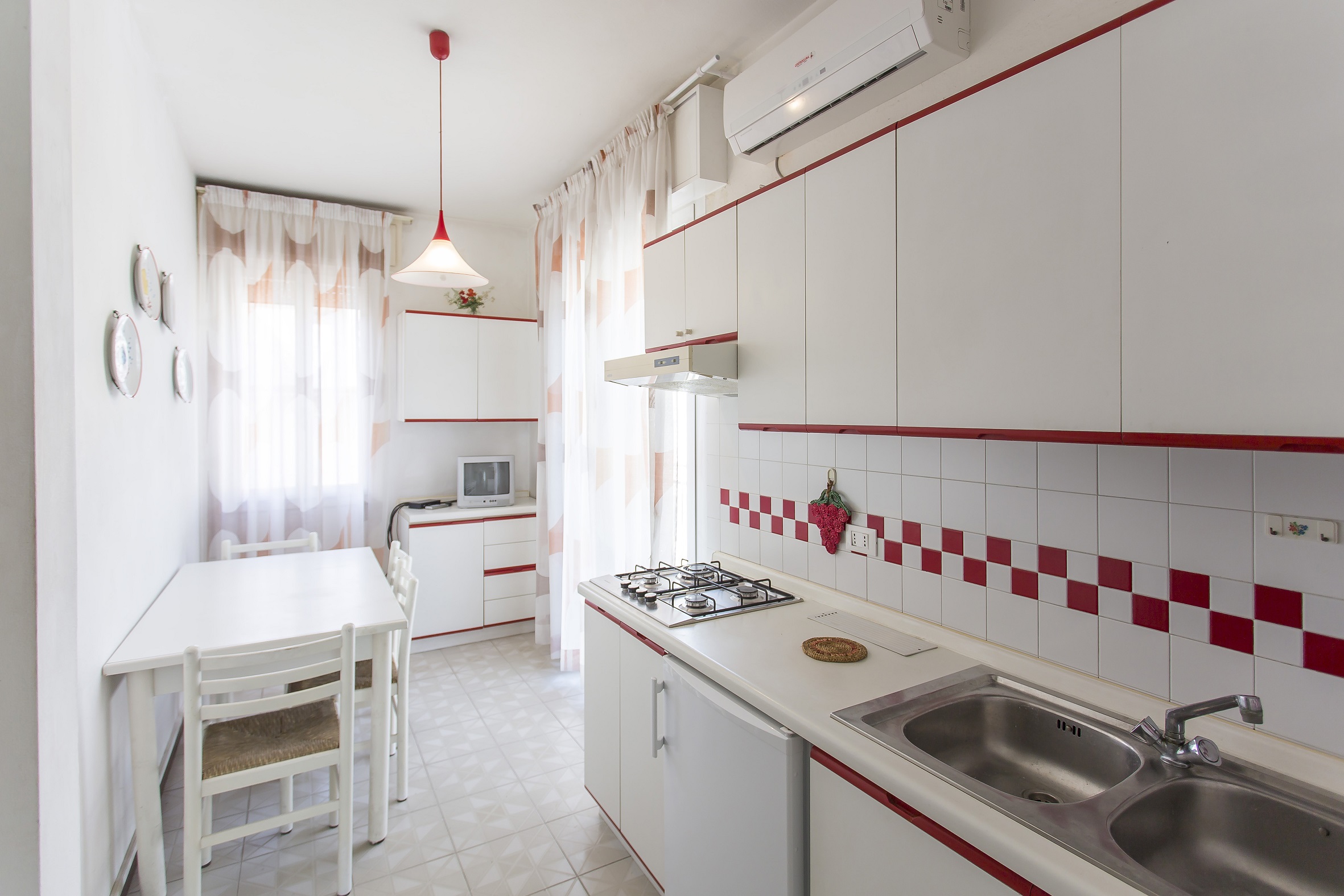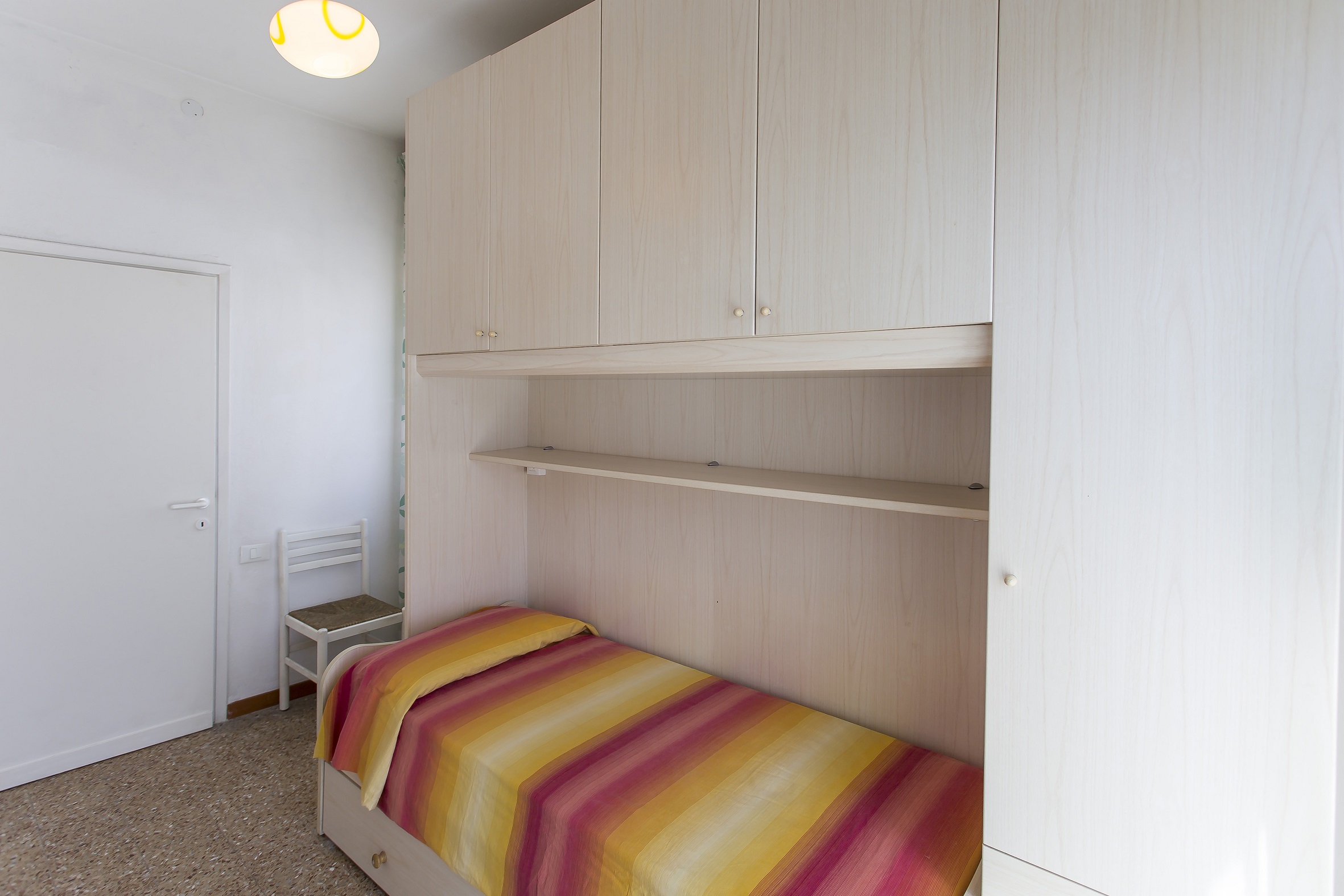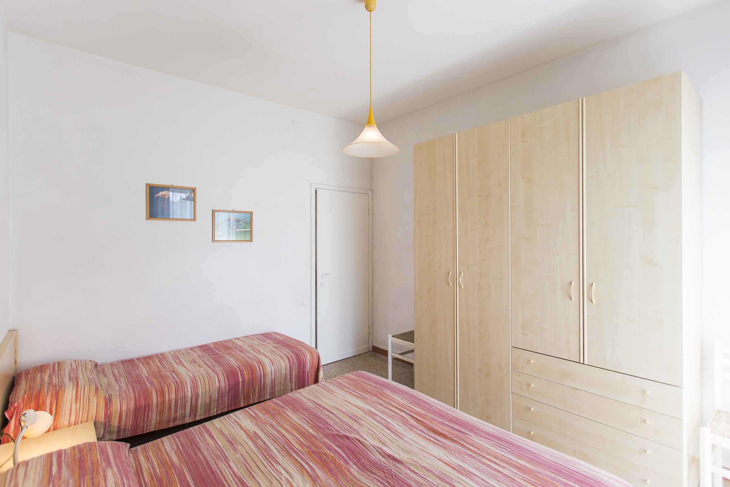3 Raum Wohnung mit 5 Betten. 3-Zimmer-Wohnung im 2. Stock (ohne Aufzug), bestehend aus 1 Schlafzimmer mit Ehebett und Einzelbett, 1 Schlafzimmer mit zwei Einzelbetten, Kueche ohne Sofa, Badezimmer, Balkon. "Casa Giannina A" ist ein kleines eingezaeuntes Wohngebaeude auf der Meerseite nur 40 Meter vom Strarnd entfernt im Zentrum von Lido di Jesolo zwischen Piazza Mazzini und Piazza Brescia. Es besteht aus Wohnungen verschiedenster Typologien mit TV und Klima, einige auch mit Balkon. Strandplatz obligatorisch gegen Gebuehr, nicht im Preis inbegriffen. Eingezaeunter, numerierter Parkplatz fuer 1 Auto pro Wohnung.