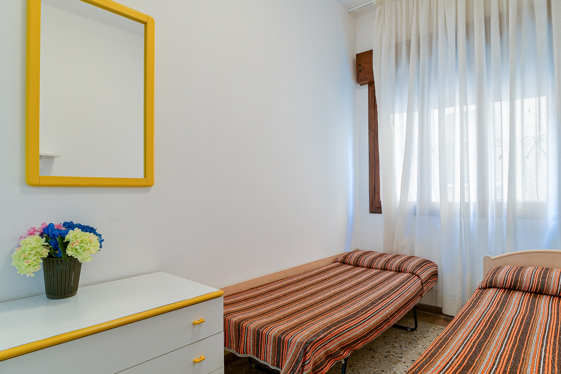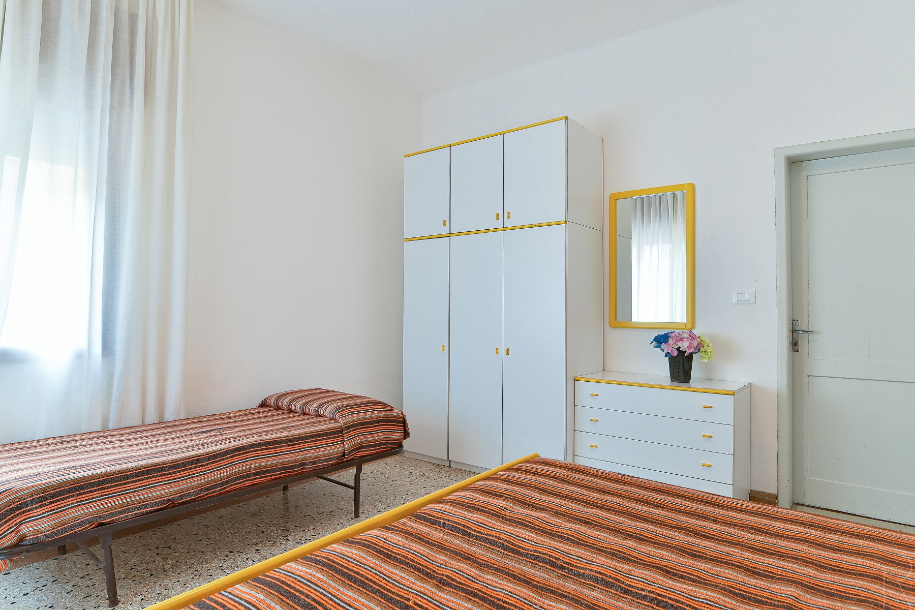 3-Raum-Wohnung mit 6 Betten, ohne Balkon im 2.Stock. Bietet 1 Schlafzimmer mit Doppelbett + Stockbett, 1 Schlafzimmer mit Doppelbett. Wohn/Esszimmer mit 1 Doppelschlafcouch, Küchenzeile. Badezimmer. Das Haus "Zenith" ist eine Villa nur 10 Meter vom Strand entfernt in Lido di Jesolo in ruhiger aber centraler Lage in der Naehe der Piazza Trieste umgeben von Restaurants, Bars und Geschaeften. Kleiner Privatstrand vor dem Haus. Die Villa besteht aus 8 Wohnungen ueber 3 Stockwerken (kein LIft), einige davon mit grossen Balkonen zum Meer. Alle mit TV, Kima und Waschmaschine. Die Wohnungen mit 3 Schlaefzimmern verfuegen ueber 2 Baeder. Strandservice gegen Gebuehr (obligatorisch) nicht im Preis inbegriffen. Numerierter Parkplatz beim Haus.