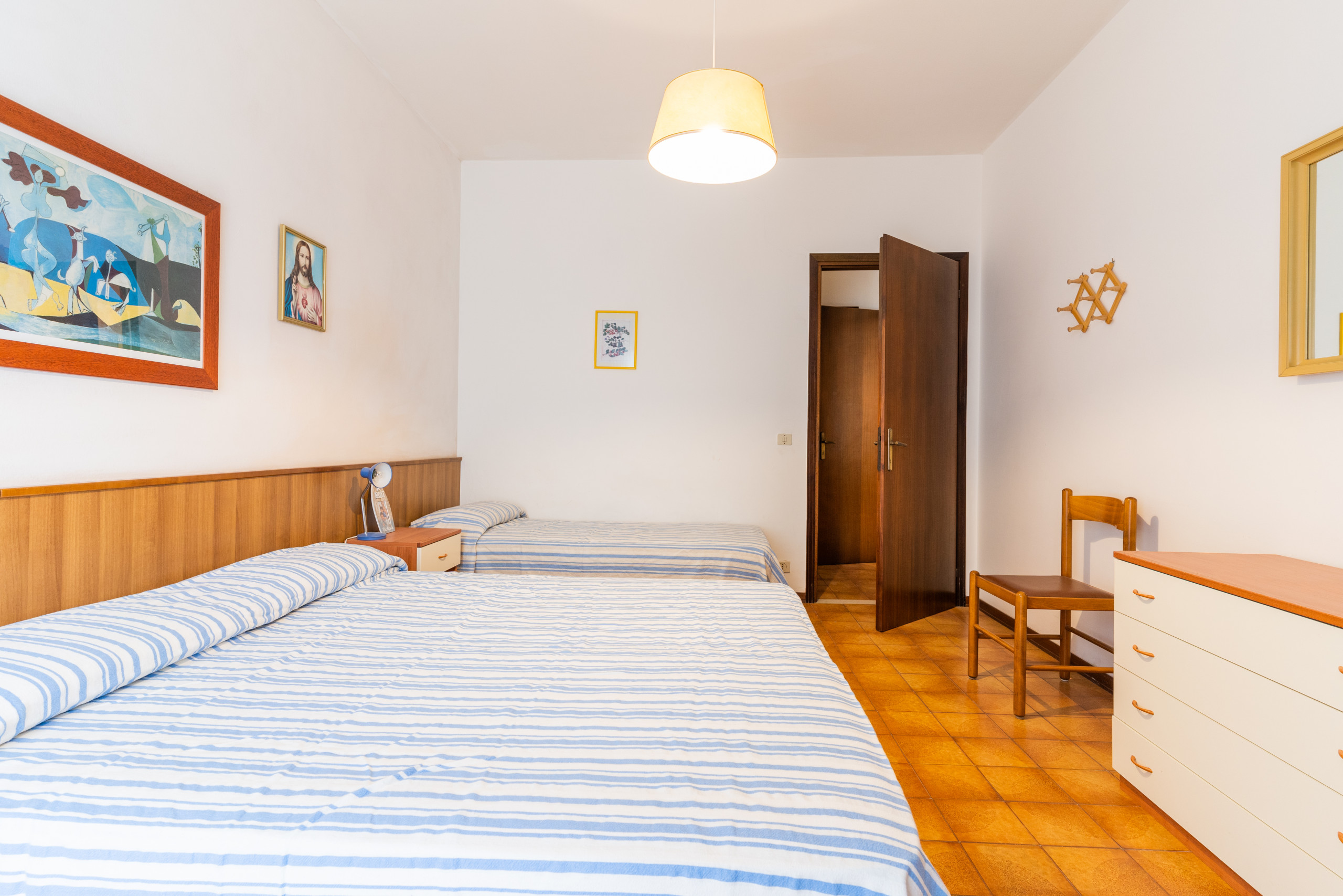 - Einem Schlafzimmer mit einem Doppelbett und einem Einzelbett.