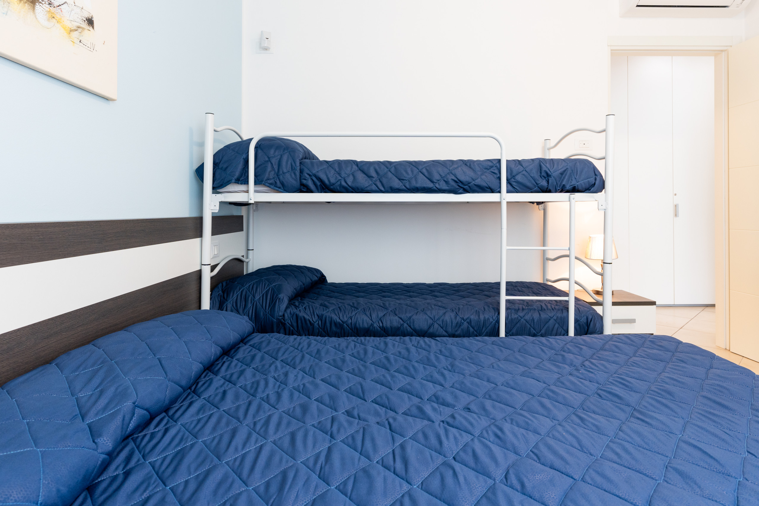- Einem Schlafzimmer mit einem Doppelbett und einem Stockbett.