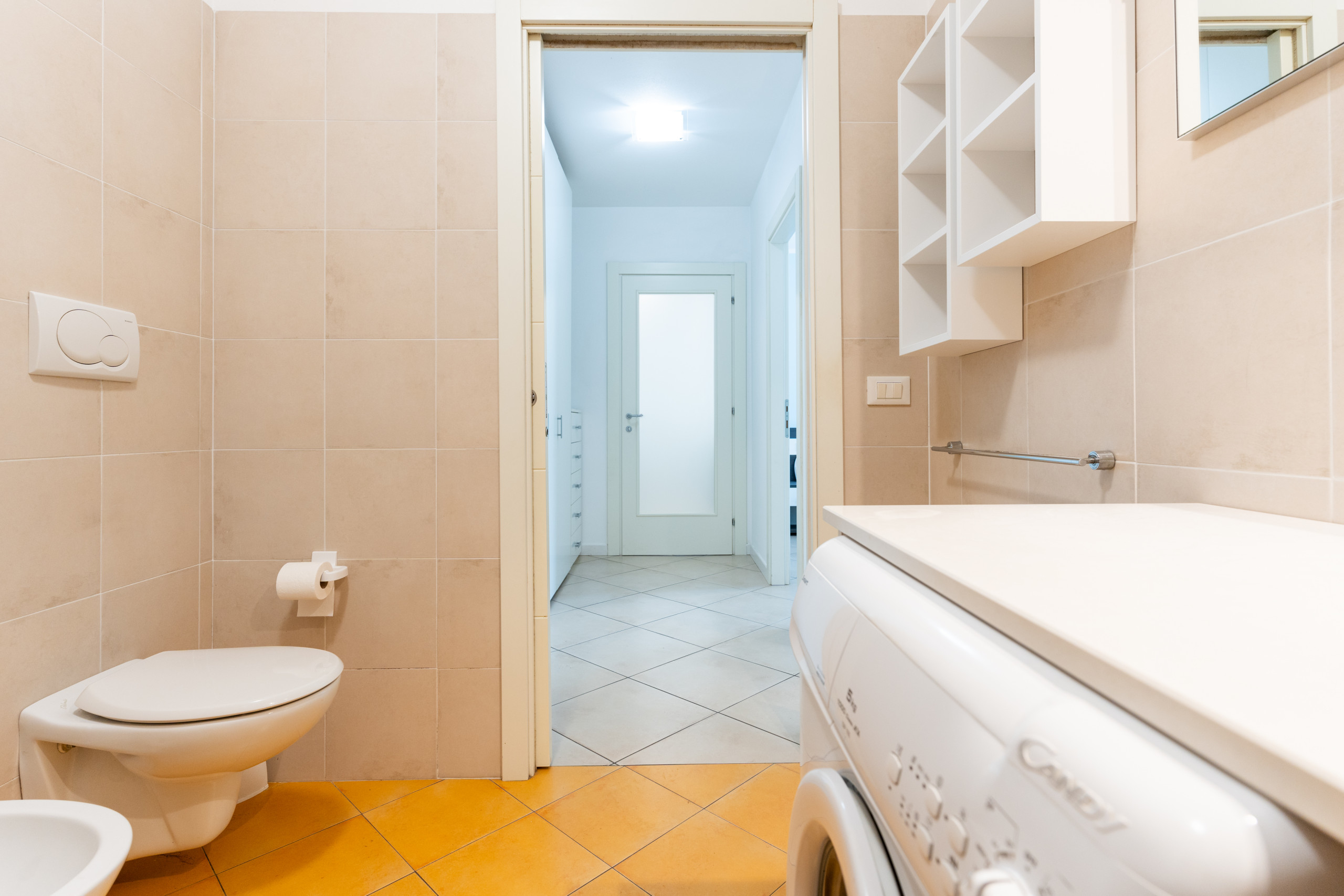 - Einem Badezimmer mit Duschkabine, Waschmaschine
