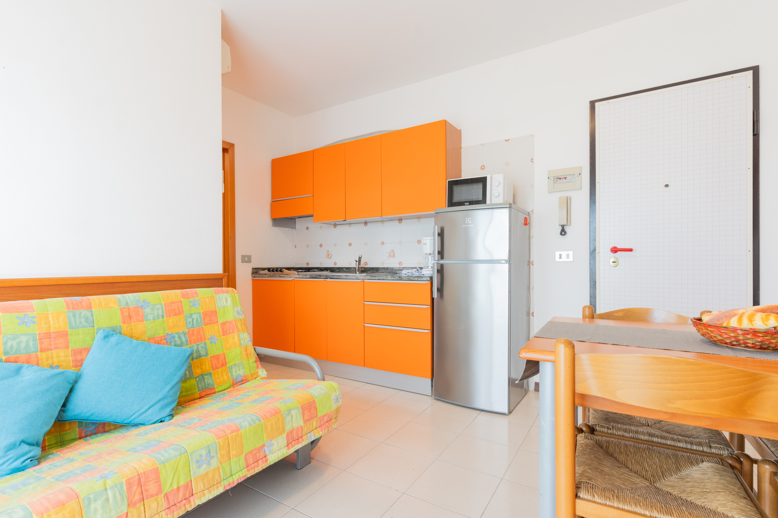 - living room with kitchenette and double sofa bed