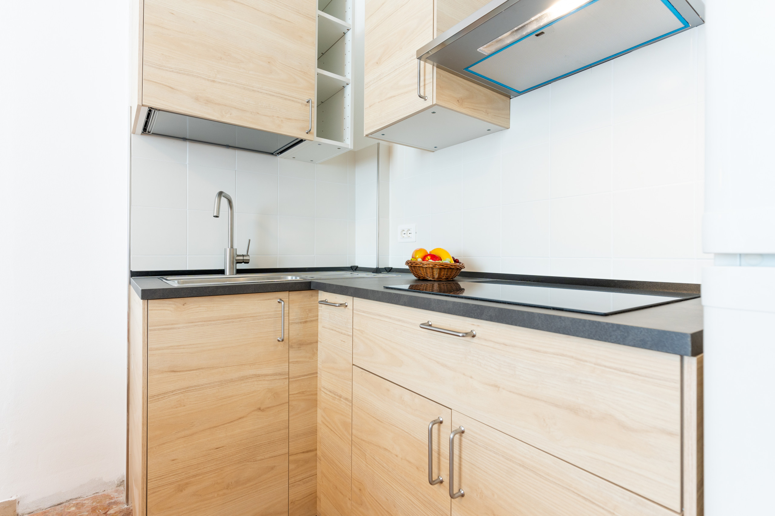 - a living room with a modern kitchenette equipped with an induction hob and a double sofa bed