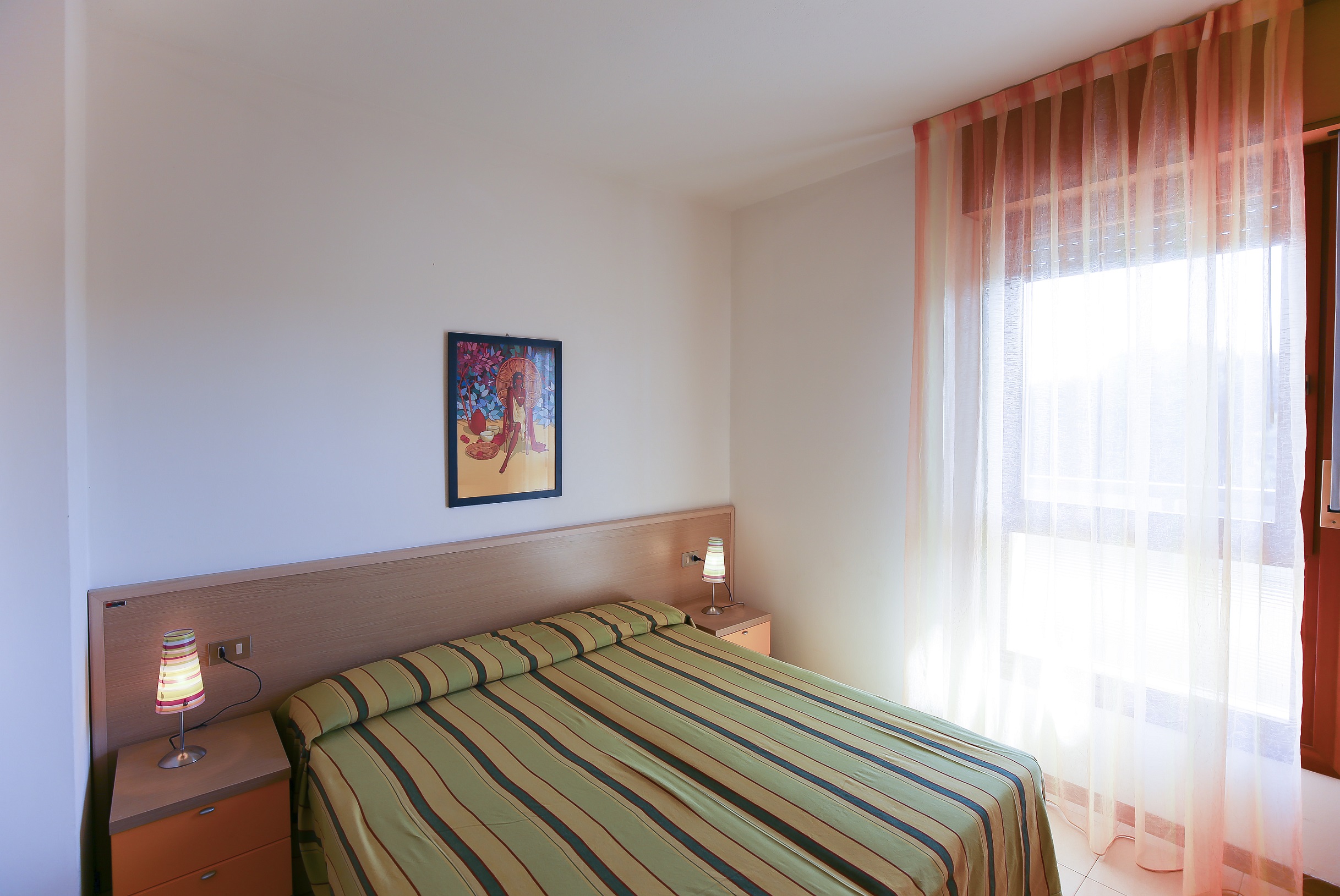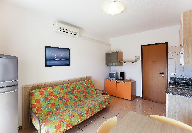 Three rooms apartment with living room with kitchen and double sofa bed, bedroom with double bed, bedroom with two single beds, bathroom and balcony. Campiello is an apartment house in Bibione Lido del Sole, 400 metres far from the sea, with pool for adults and for children and washing machine. All flats are renewed, they have pool view, satellite tv, air conditioner, microwave oven, security door and numbered parking place. Beach service in price included.