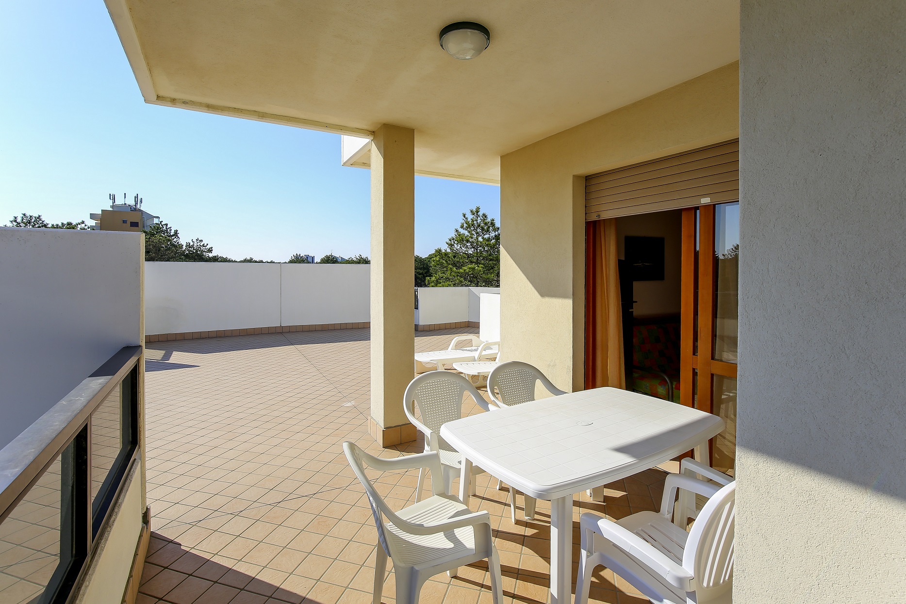 The renovated three-room apartments, located between the second and third floors, offer spacious terraces or balconies facing south or north-west, ideal for enjoying a coffee in the sun or an outdoor dinner while admiring different views of Bibione.