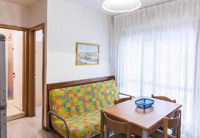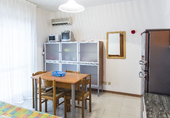 Two rooms apartment with balcony with living room with kitchen and double sofa bed, one bedroom with double bed and bathroom. Castello is located in a green area of Bibione Lido del Sole, with swimming pool for adults and children. The flats are renewed and from the 5th floor with panoramic view. They are provided with comfortable furniture, each flat has a numbered parking place, air conditioning and satellite-tv. Beach service in price included.