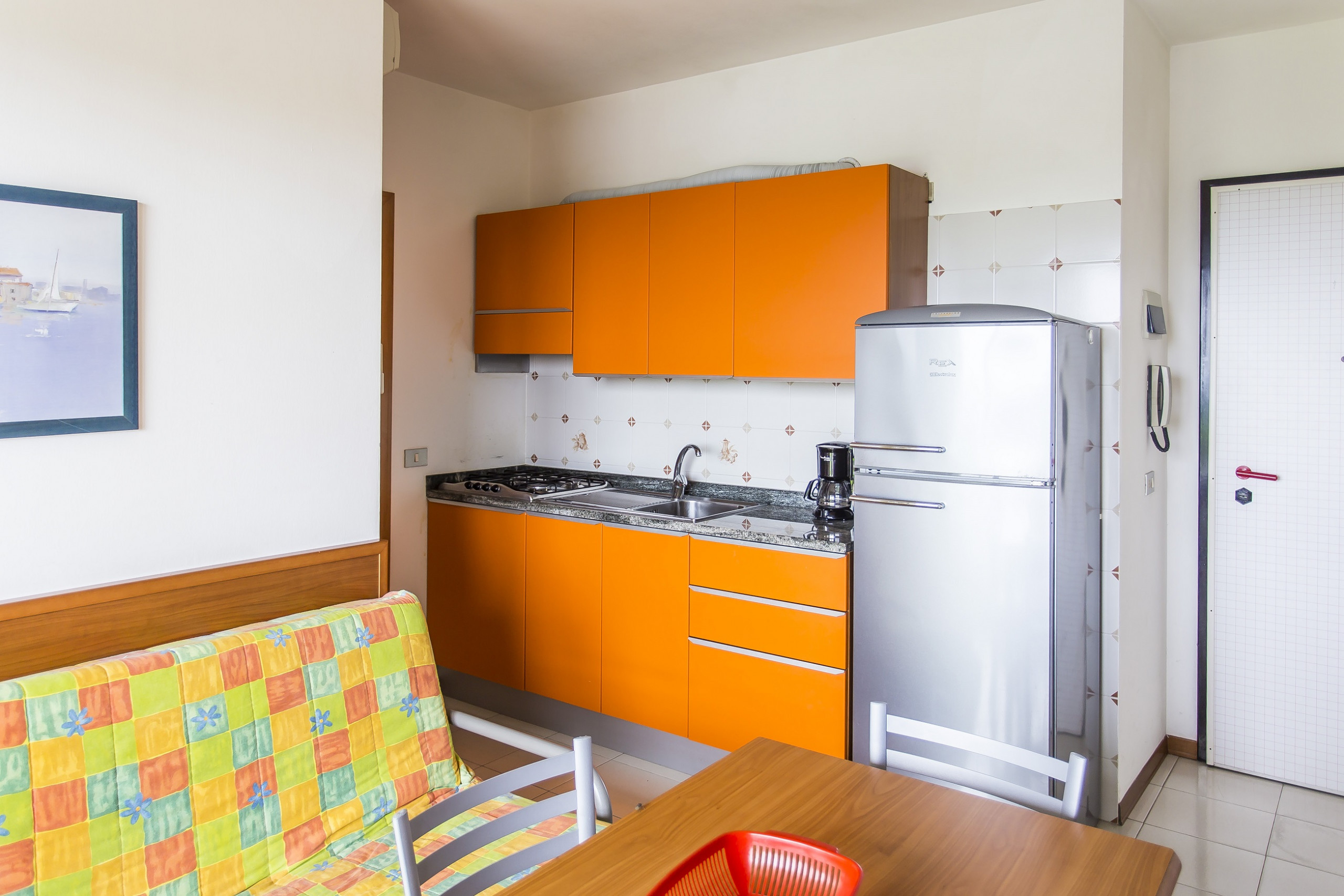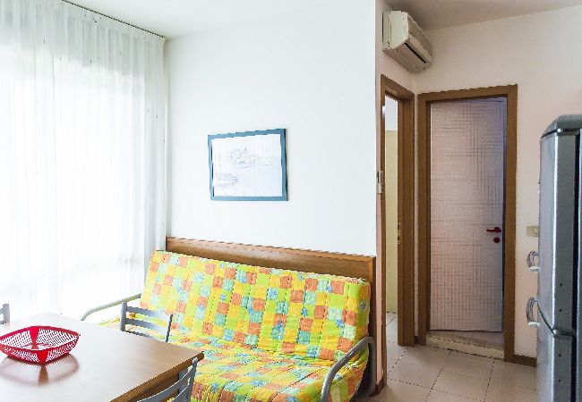 Two rooms apartment with balcony, living room with kitchen and double sofa bed, bedroom with double bed and bathroom. Castello is located in a green area of Bibione Lido del Sole, with swimming pool for adults and children. The flats are renewed and from the 5th floor with panoramic view. They are provided with comfortable furniture, each flat has a numbered parking place, air conditioning and satellite-tv. Beach service in price included.