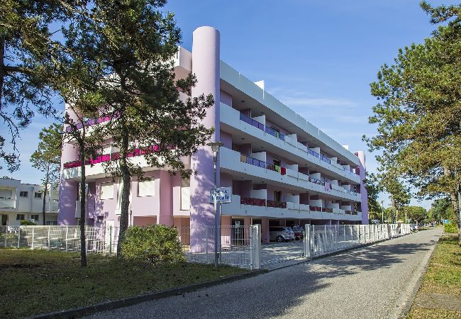 Three rooms apartment with balcony. Living room with kitchen and double sofa bed, bedroom with double bed, bedroom with 2 single beds and bathroom. Ducale is an apartment house located in a green area in Bibione Lido del Sole, 350 metres far from the sea, with pool for adults and for children. All flats have been renewed and have statellite tv, air conditioner, security door and numbered parking place, some of them are under the building. Beach service in price included.