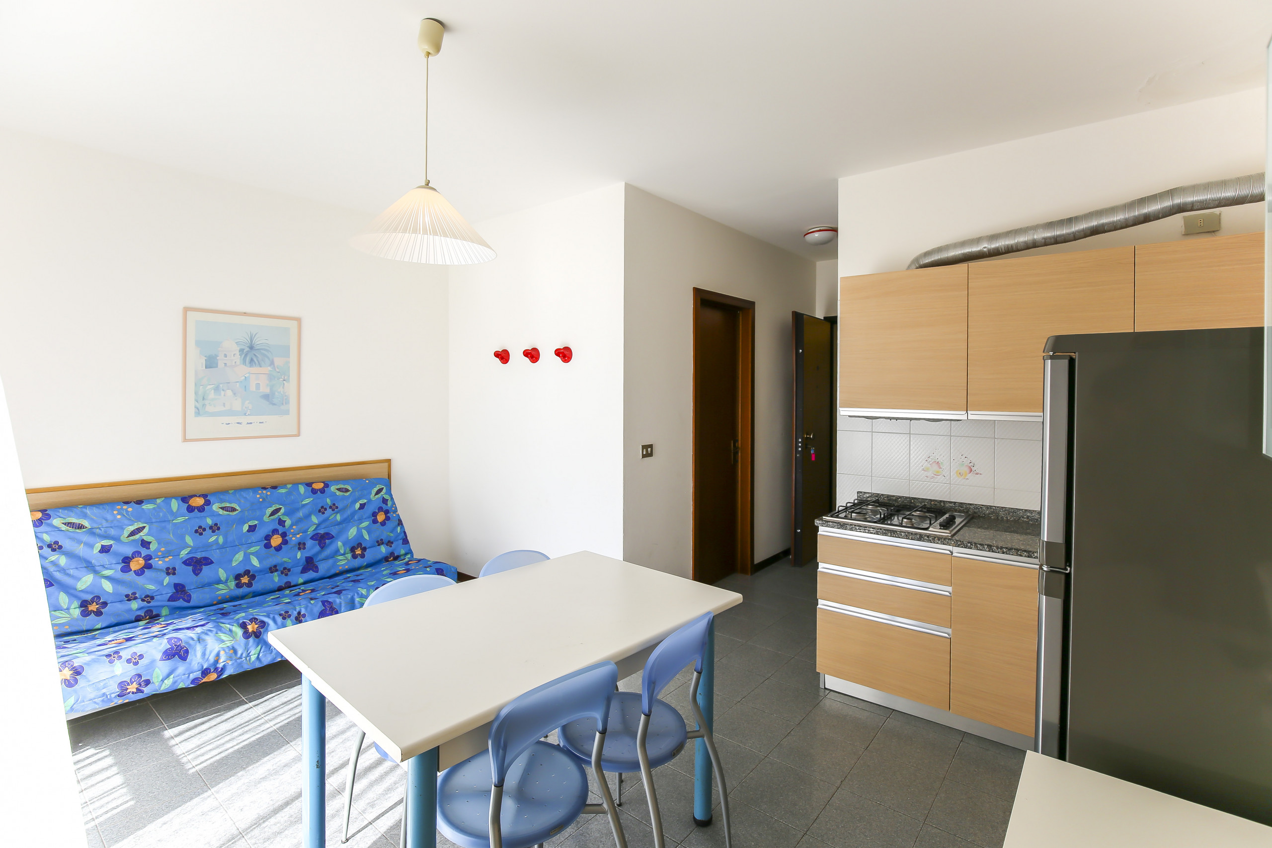 The interiors consist of a living room with an equipped kitchenette, a double sofa bed and two single armchairs with beds, as well as a windowed bathroom with a shower enclosure.
