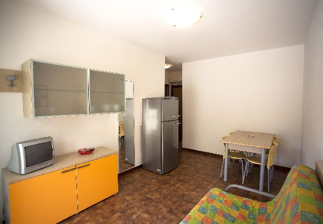 Two-rooms apartment with balcony. Living room with kitchen and double sofa bed, bedroom with double bed and bathroom. Rialto is a renovated building in Bibione Lido del Sole, made up of 24 flats, wide inside court located in a quiet area in the pinewood, it has got a swimming pool for adults and one for children. Some of them with panoramic view. All flats have air conditioning, tv-sat and microwave oven, garden-set and numbered parking place. Beach service in price included.