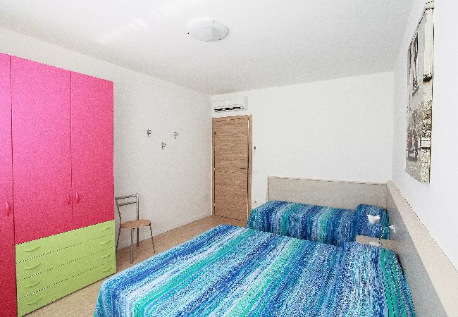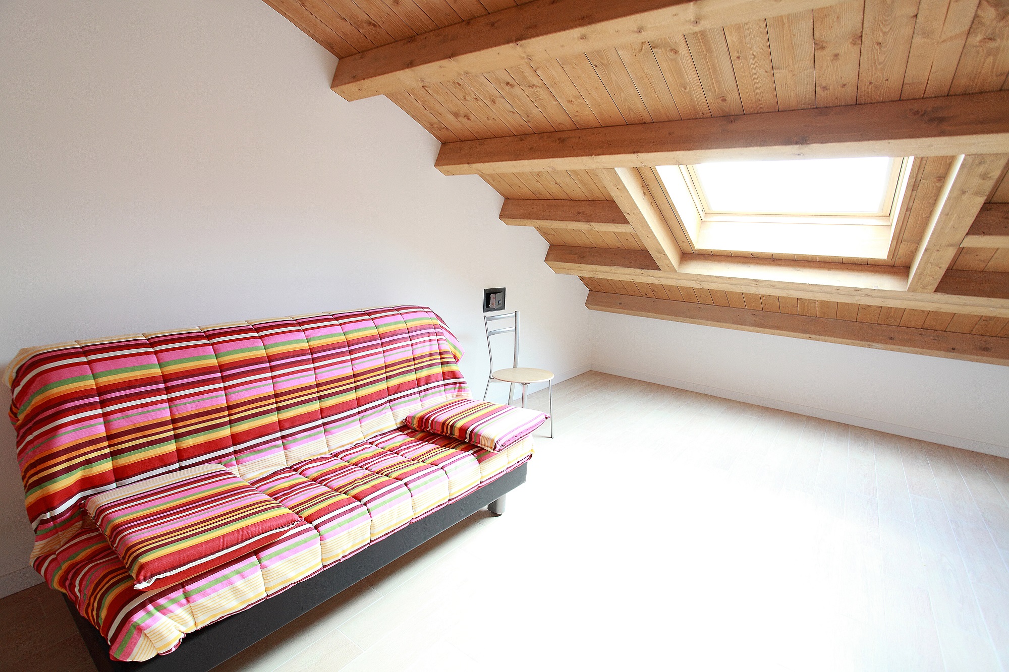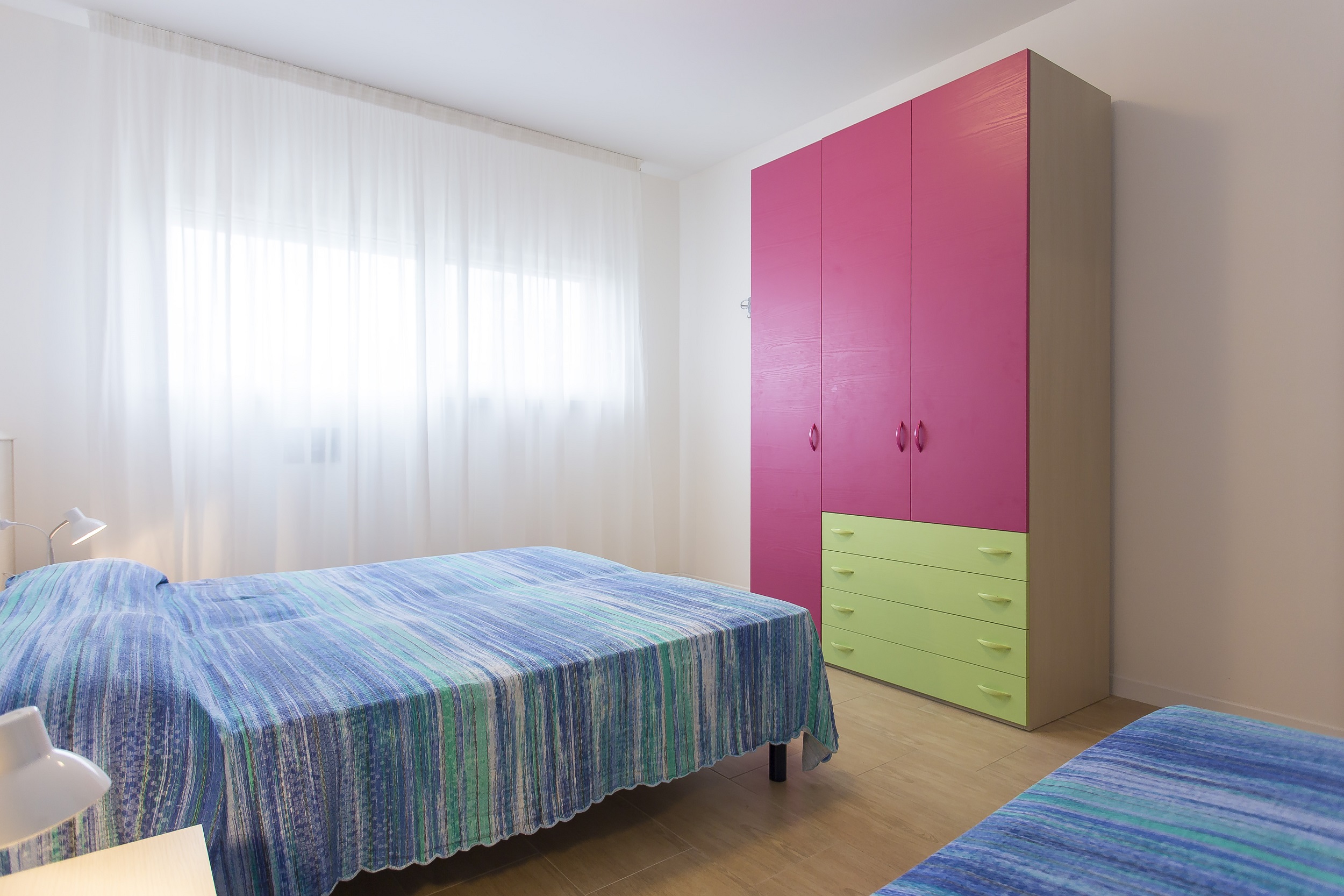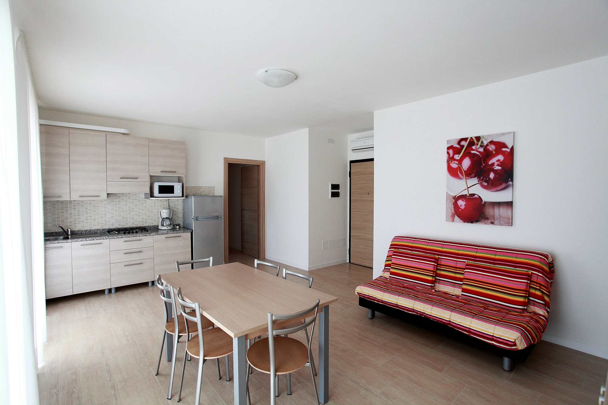 Two-room apartment located on the second floor with terrace composed of a living room with kitchen-corner and double sofa bed, a double bedroom with third bed, bathroom with shower and mansard with bathroom and a bed. All apartments are equipped with air conditioning, refrigerator, microwave, german coffee maker, LCD satellite TV, safe, hairdryer, security door, wifi and covered parking space in the garage or uncovered parking space. In the common area there are play-ground area for children, a grill area and a swimming pool.